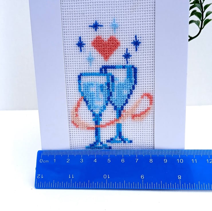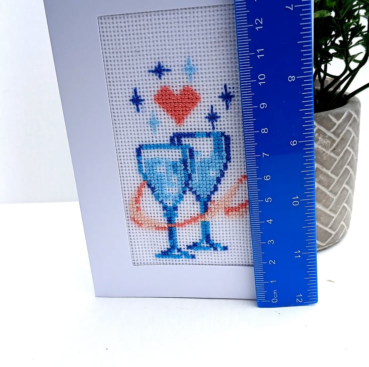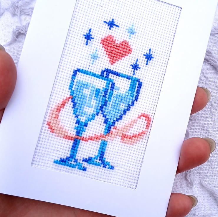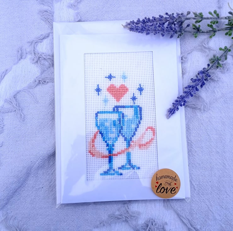 Celebrate love, joy and special moments with this handmade cross stitch card featuring two clinking champagne glasses and a tiny red heart above them. Stitched entirely by hand, this design brings a charming, personal touch to weddings, anniversaries, engagements or any romantic celebration.