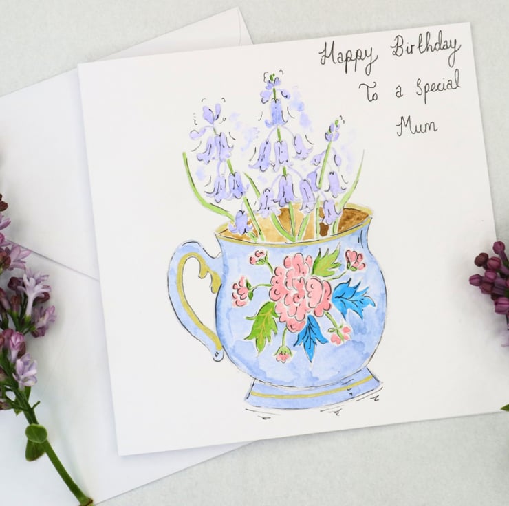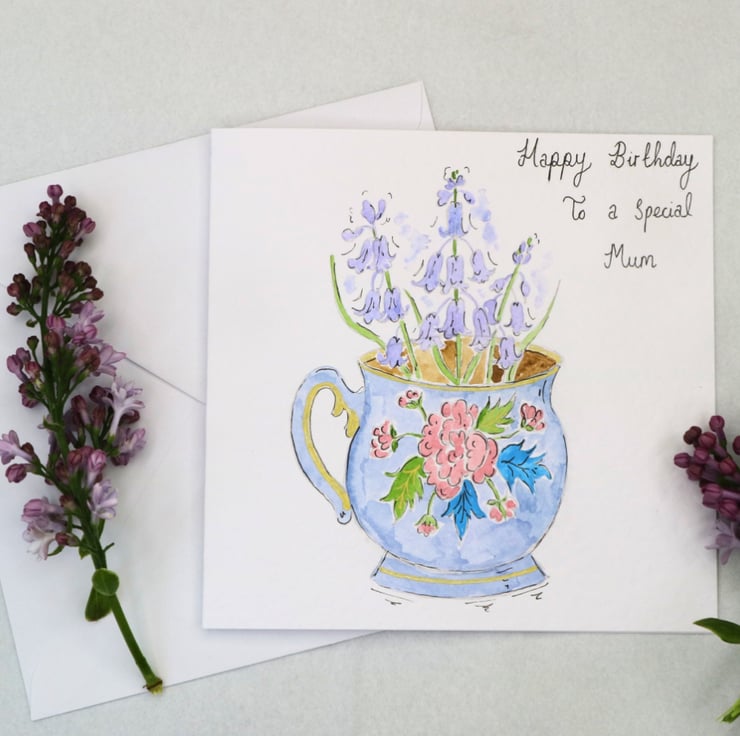 A beautiful hand-painted watercolour Bluebell and teacup greetings card. A special and unique card ideal for Mother's day or a special birthday.