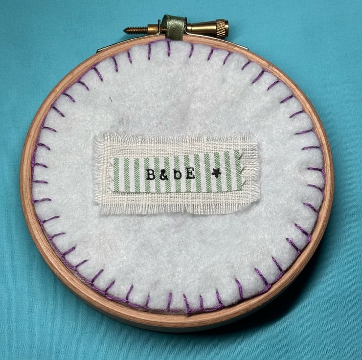 This beautiful 4 inch hoop art features a true bouquet of tiny hand embroidered flowers, with fine attention to detail, and completed in DMC silk thread. Look closely for mice in love, a snail on a trail, and a garden spider hanging in the wind. Produced on linen and fully backed in white felt, with B&bE logo tag and green hanging ribbon. Stitches include French knots, stem stitch, satin stitch, bullion knots, lazy daisy, and fern stitch. Presented here by Webster who helped with tacking. A completely unique design!