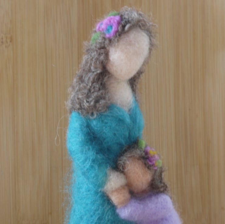 Handmade needle felted ornament of a mum and her little girl on a wooden slice. Made entirely from wool and featuring boucle wool hair. Both mum and little girl also have flower decorations in their hair. Measuring 5.5 inches approx. Perfect for mothers day or a mum's birthday.
