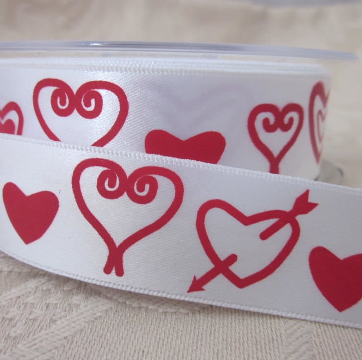 White satin ribbon with a printed pattern of hearts