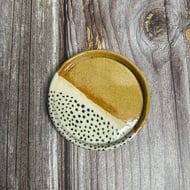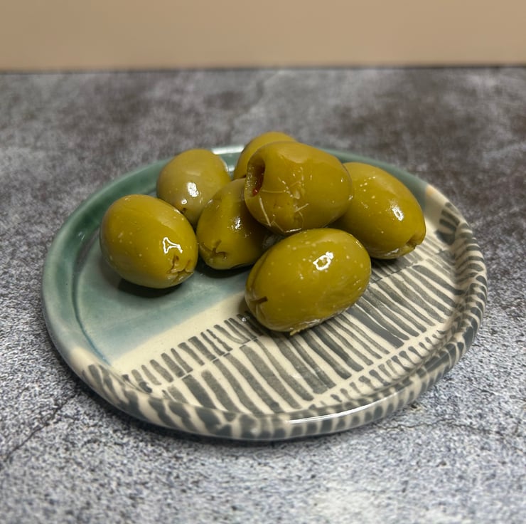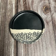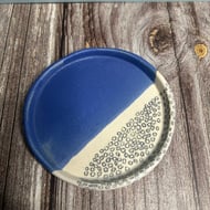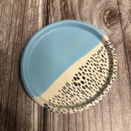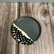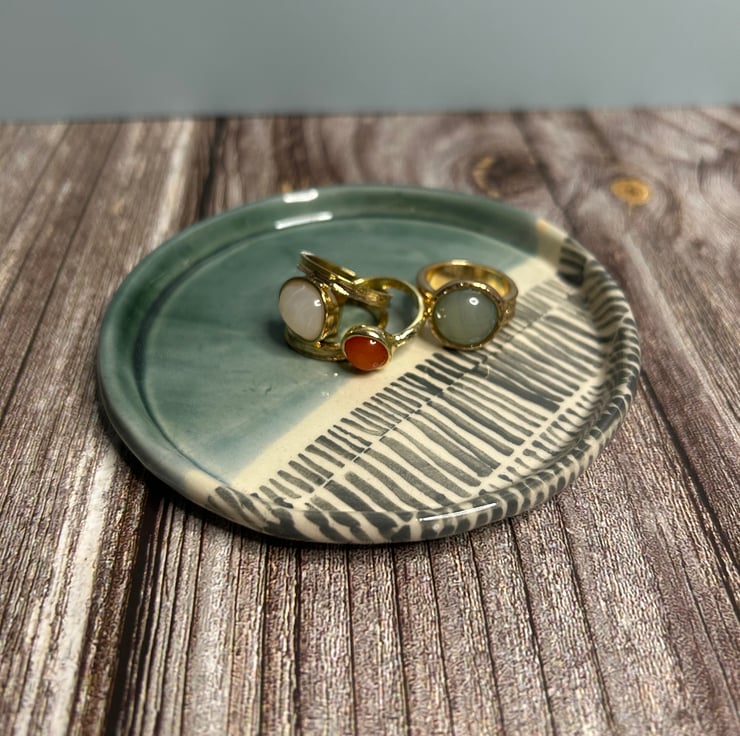 Hand made and decorated coaster or dish. Made in Brighton UK. Green blue with grey painted lines. Diameter 10cm. Versatile and can be used as a coaster or dish for food or jewellery.