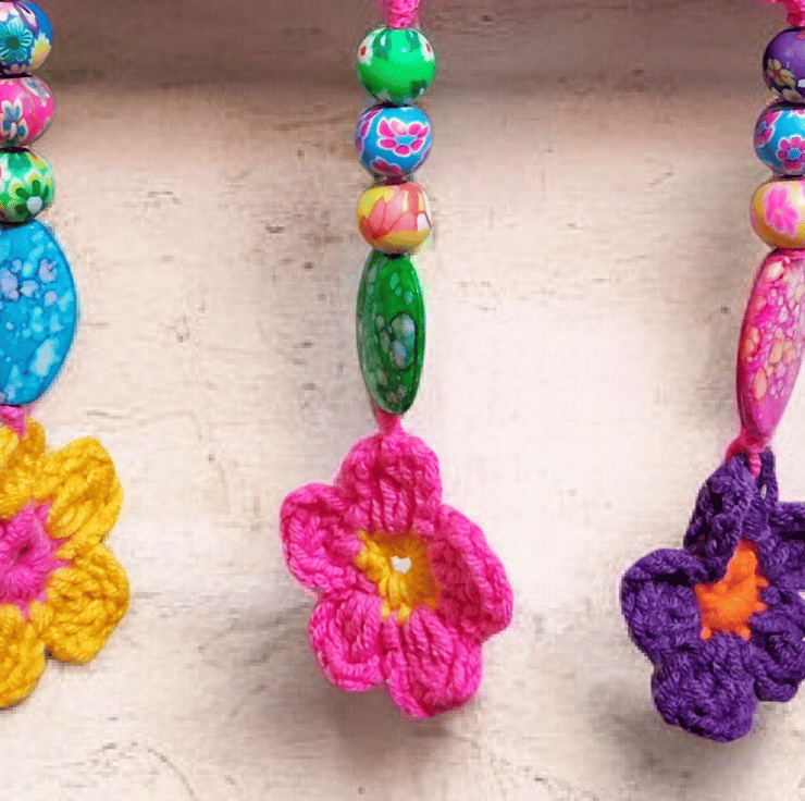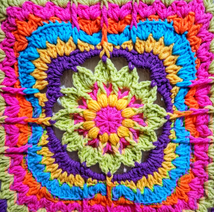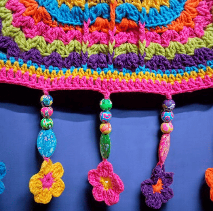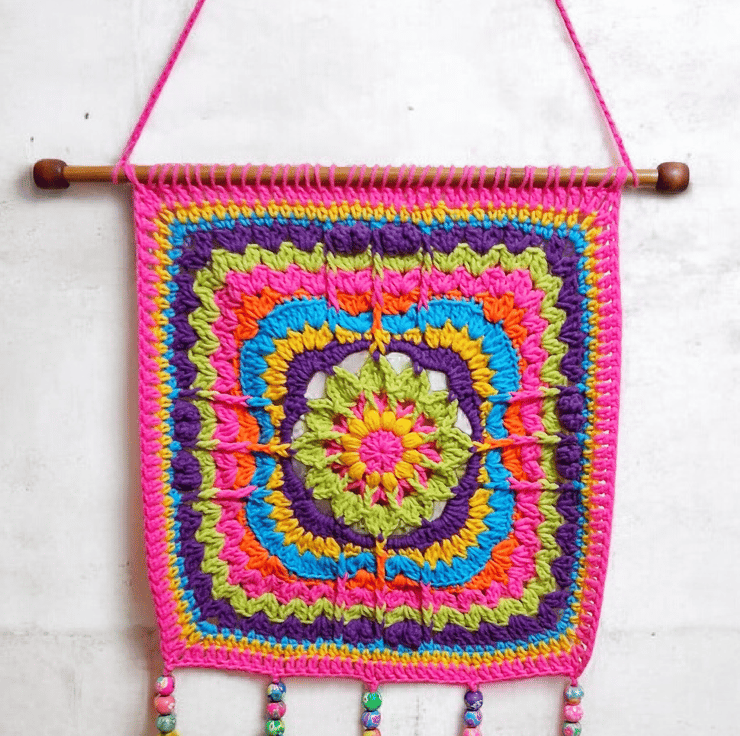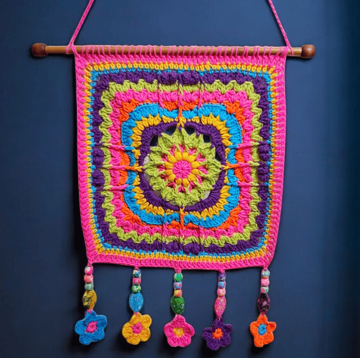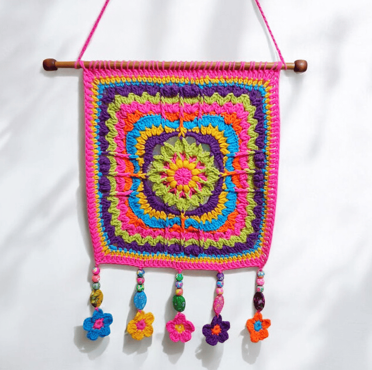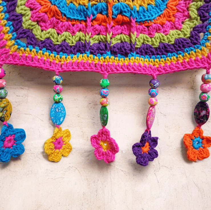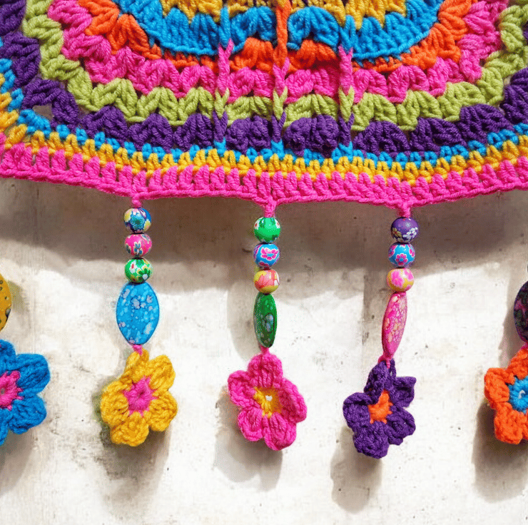 This colourful crochet wall hanging will add a pop of colour to any room. 24 cm x 36 cm including flower fringe (not including hanging loop).