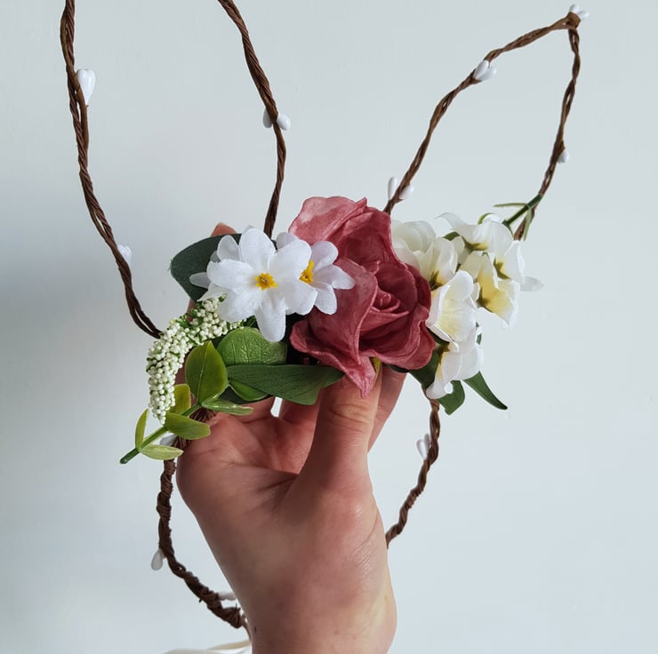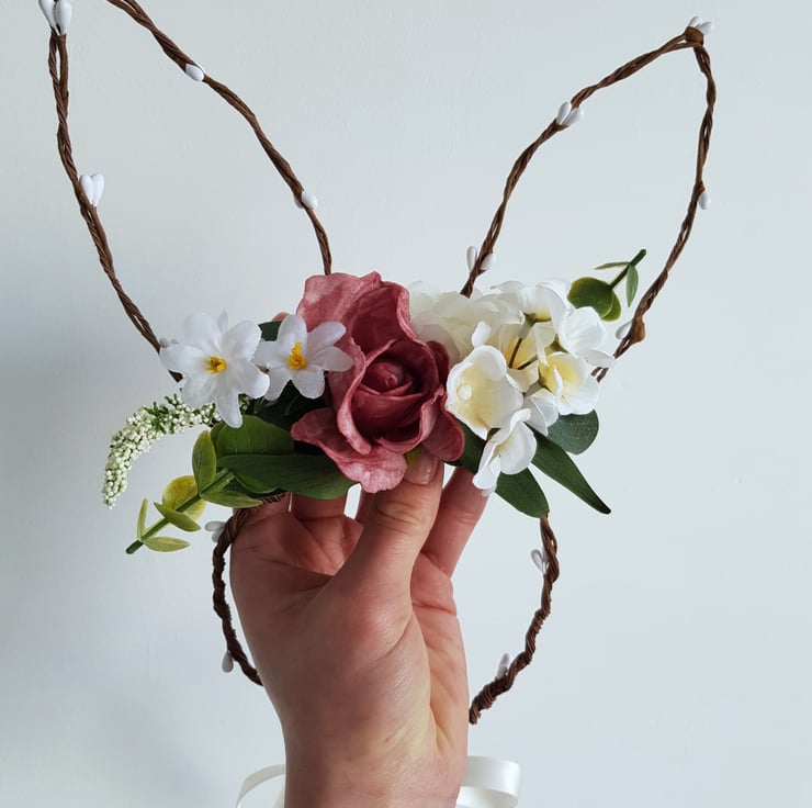 Beautiful handmade, woodland inspired bunny ears headband. Pink and white faux flowers and green foliage are fixed to a wood themed band and cute bunny ears. Fixed with a satin ribbon.