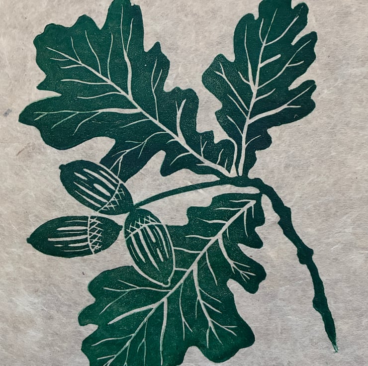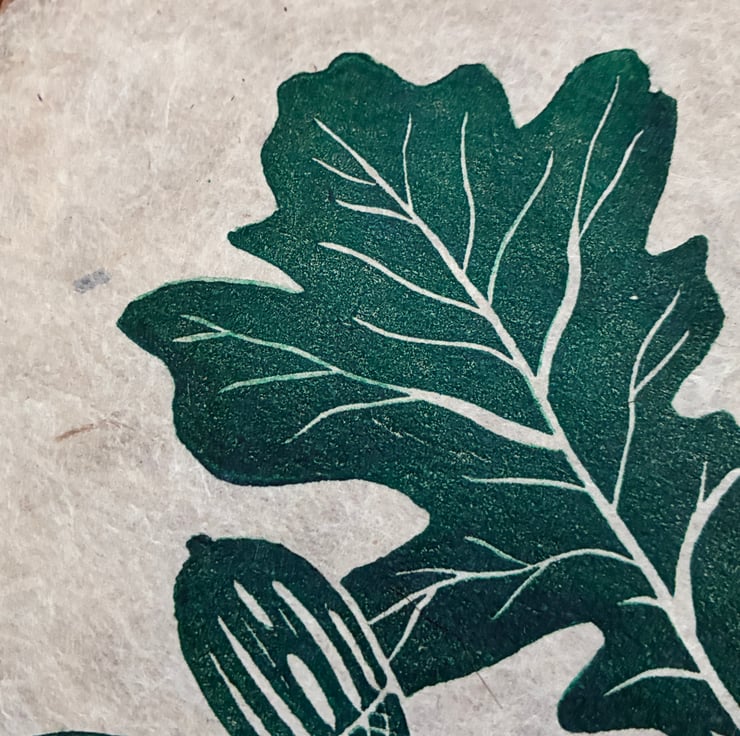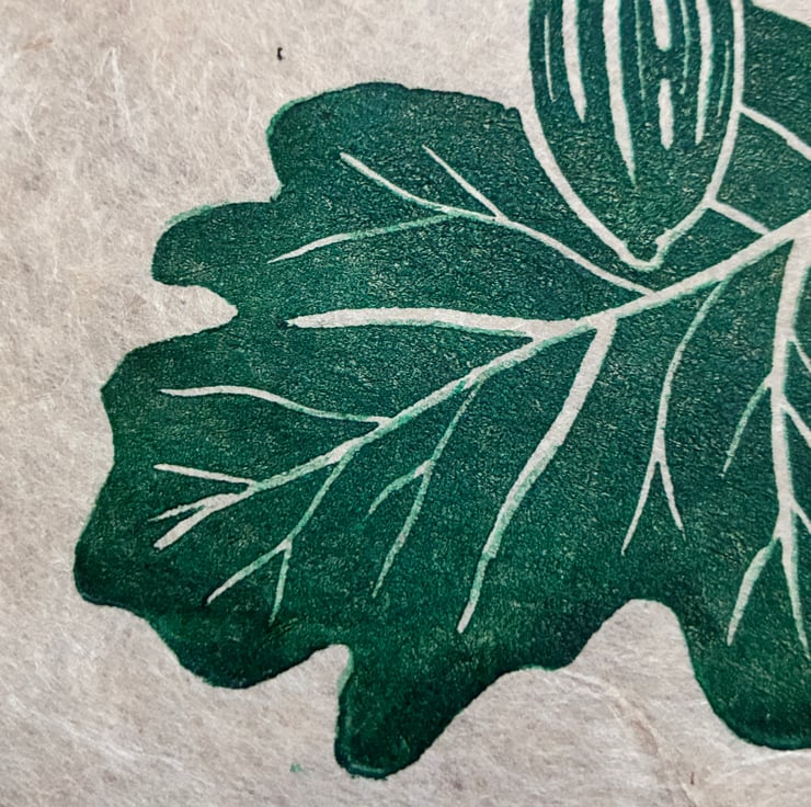 PERFECTLY IMPERFECT Oak leaf and acorn original linocut print in forest green