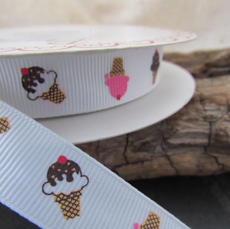 White grosgrain ribbon printed with a pattern of pink, green and brown icecream cones