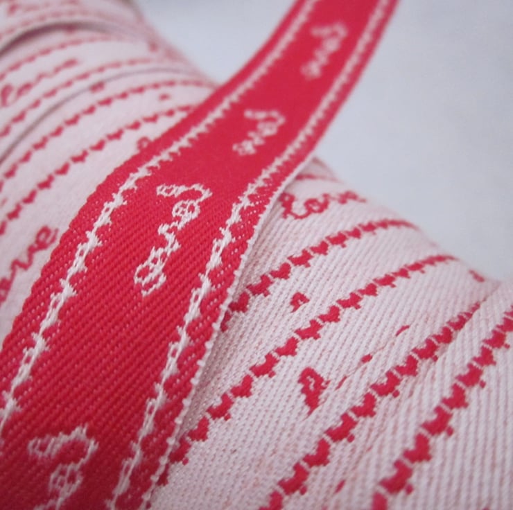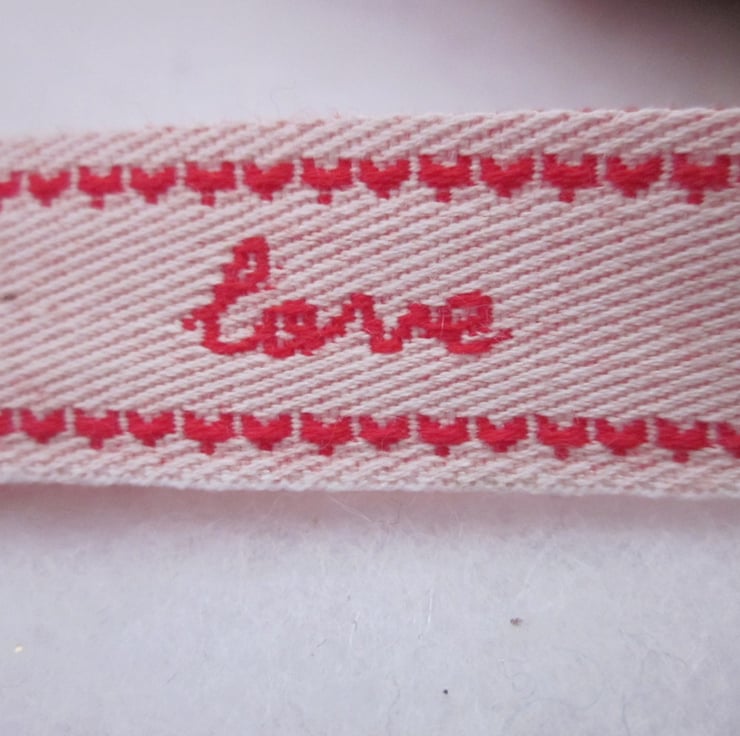 Fabulous woven ivory/ecru tape, patterned with 'love' in red script, edged with a woven stitching design