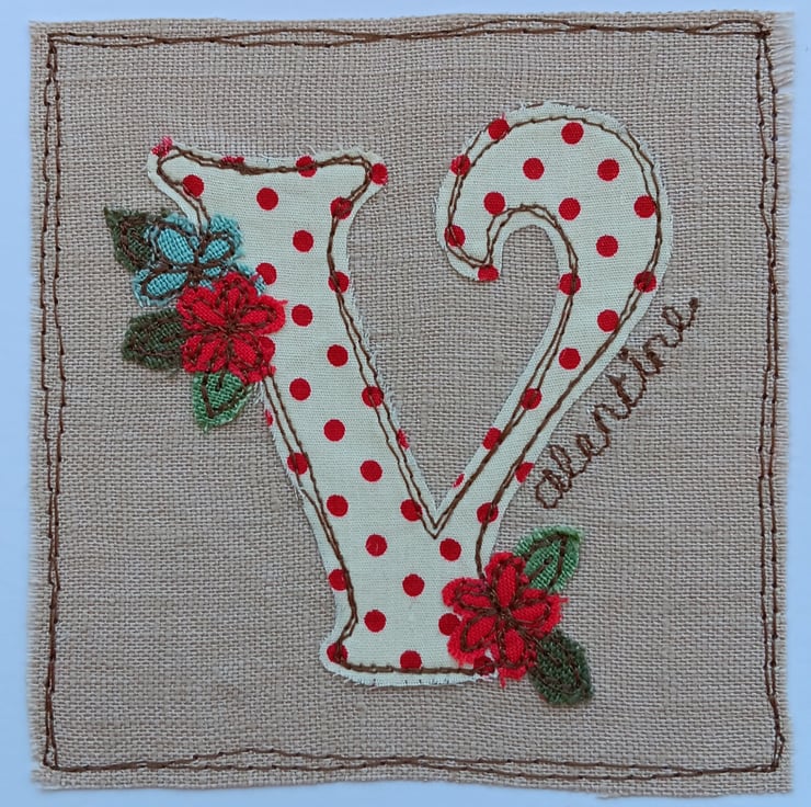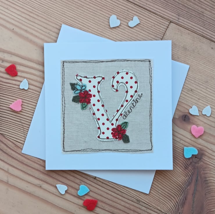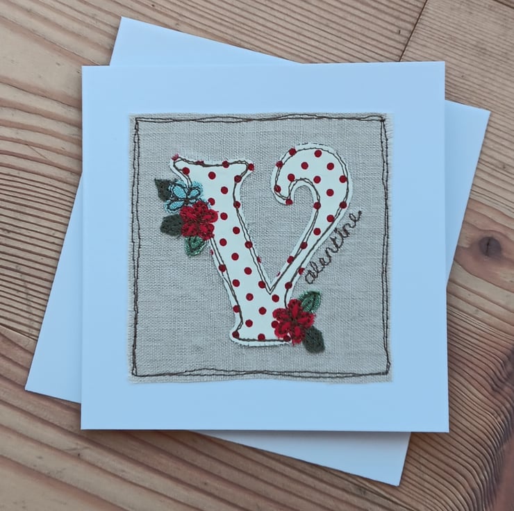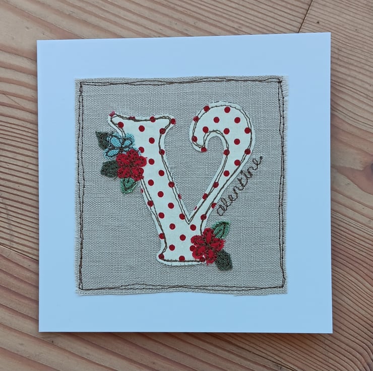 A lovely Valentine's card made by appliqueing fabric snippets onto beige linen. The design is the word Valentine embroidered on in free motion embroidery, with the letter V appliqued in red spot fabric. Red and blue flowers are added as a pretty detail.