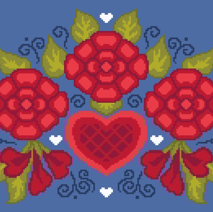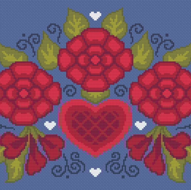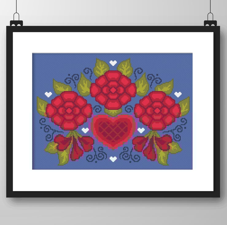 Traditional Mexican Tehuana style Valentine Roses and Love Heart Cross Stitch Pattern: Mexican style Un Ramo de Flores (PDF Counted Chart 307)
