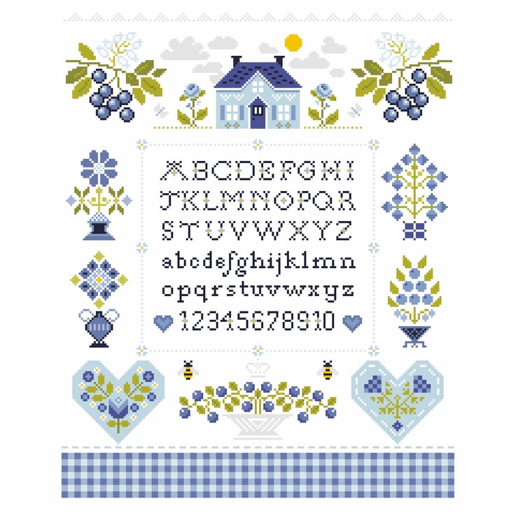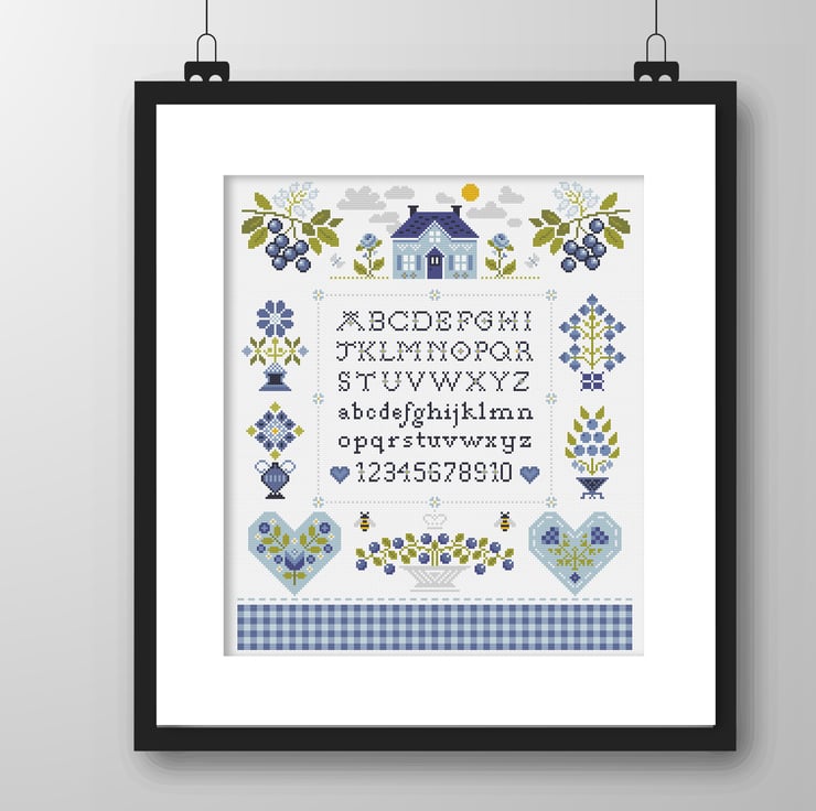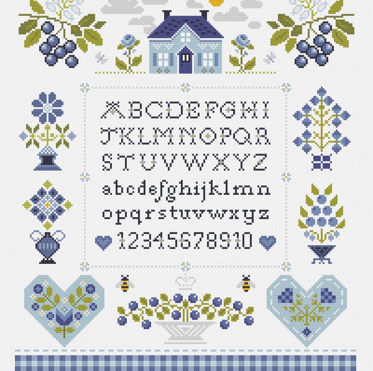 Cross Stitch Pattern Blueberry Cottage Quaker motif Alphabet Sampler, PDF counted chart 308