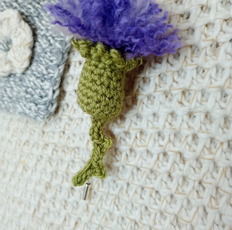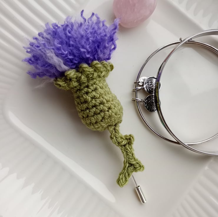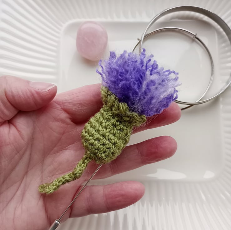 This pretty thistle stick pin brooch has been handmade using crochet yarn. In purple, lilac and green colours. The Scottish thistle is said to represent resilience, beauty and love.