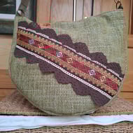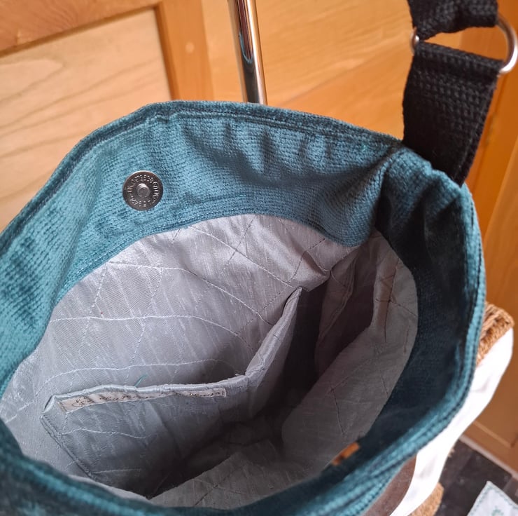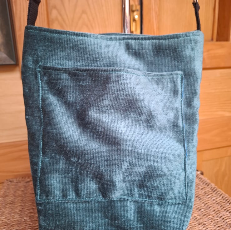 Neat crossbody bag in teal velvet and maroon brocade. Zipped front pocket, and patch pocket on the back. Lined in duck egg pure silk, with inside pocket, magnetic fastener and adjustable cotton webbing strap.