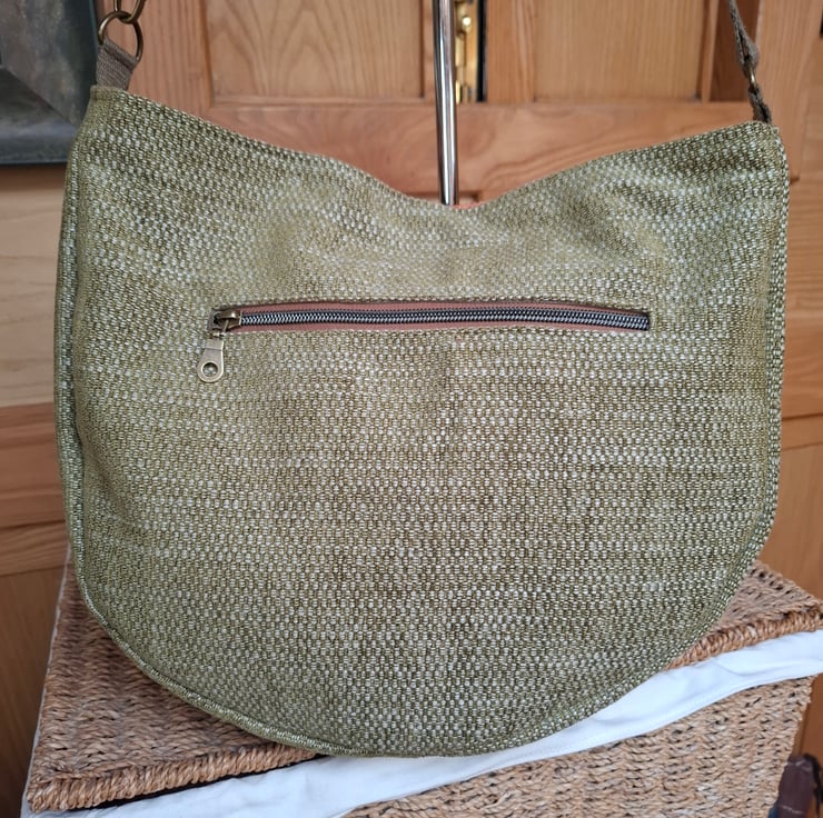 Roomy, rounded, green tweedy crossbody bag with braid and broderie anglais trim. Zipped pocket on the back. Lined in vibrant burnt orange jacquard, with inside pocket, magnetic fastener and adjustable cotton webbing strap.