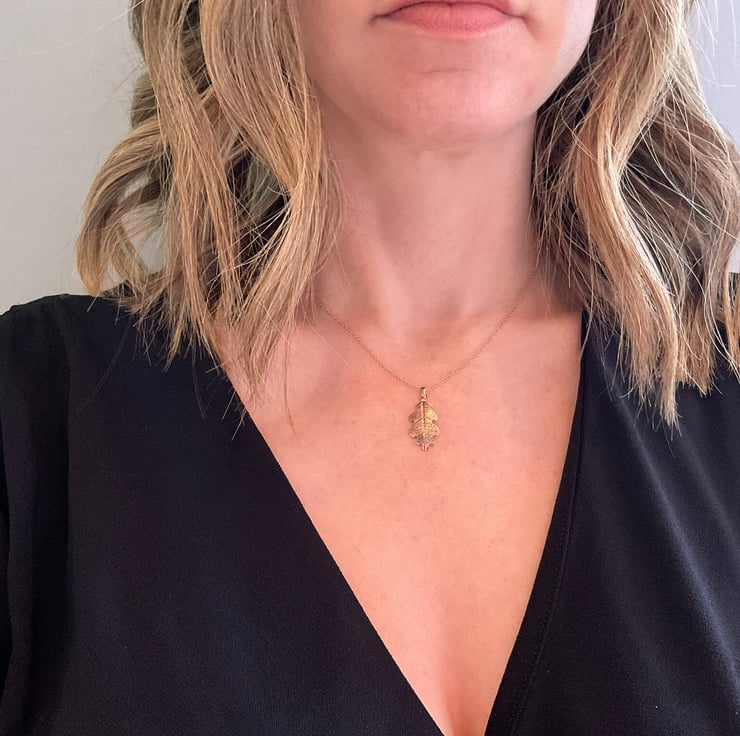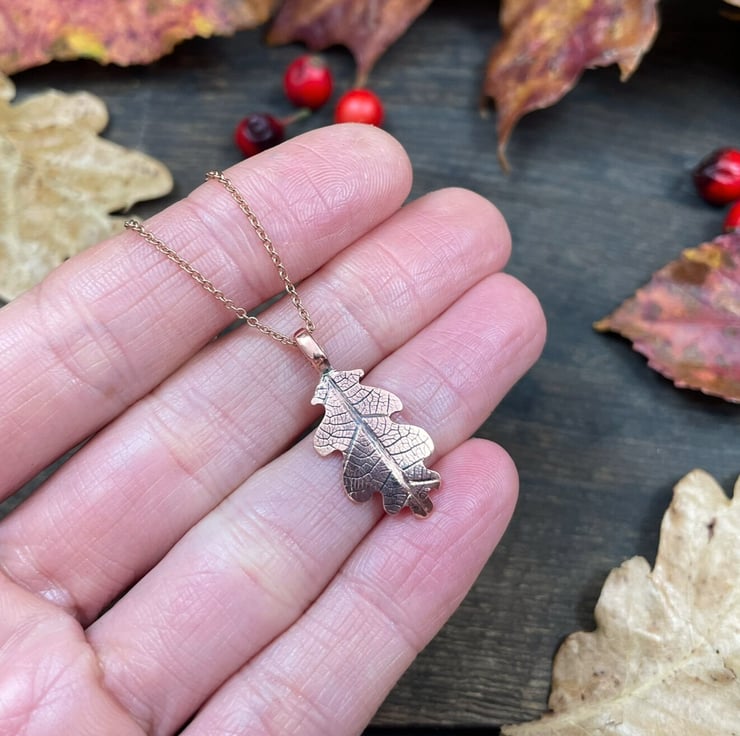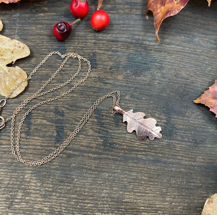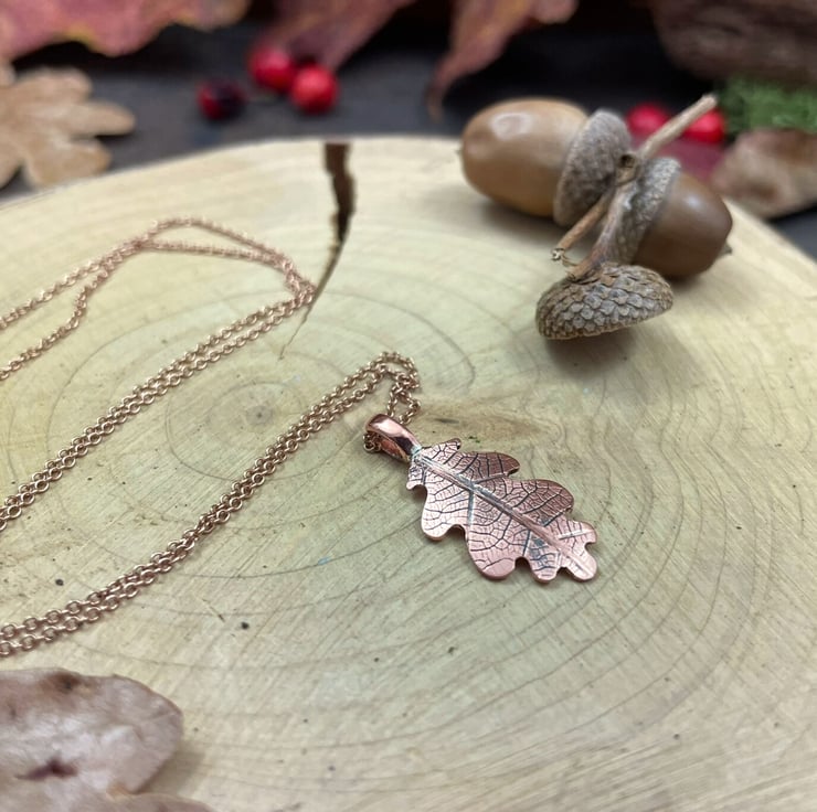 Inspired by the quiet beauty of the woodland, this necklace captures the natural shape and texture of a real oak leaf in copper.