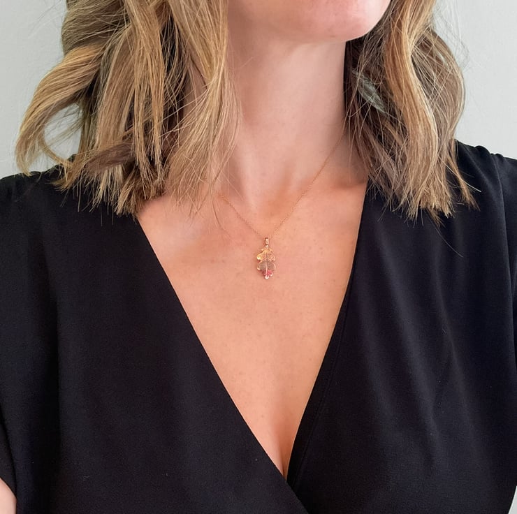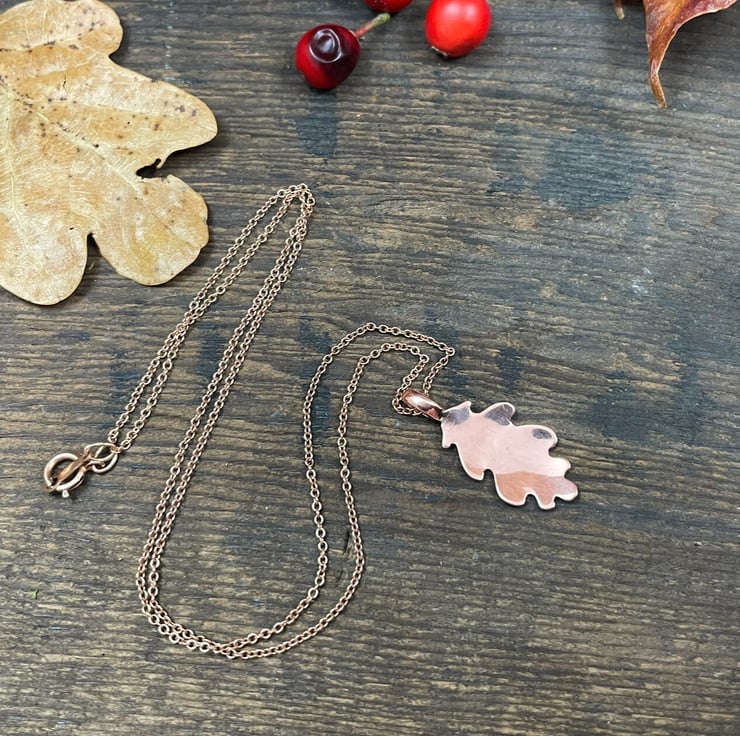 This delicate necklace is inspired by the beauty of British woodlands. The oak leaf pendant is handcrafted from copper, featuring the actual imprint of a real leaf and finished with a mirror polish to bring out its natural detail.