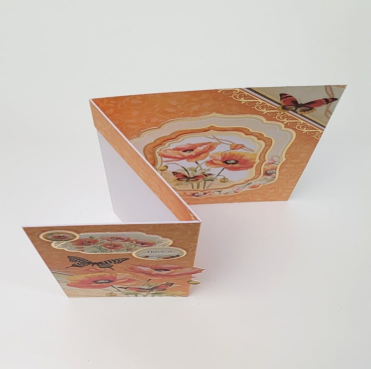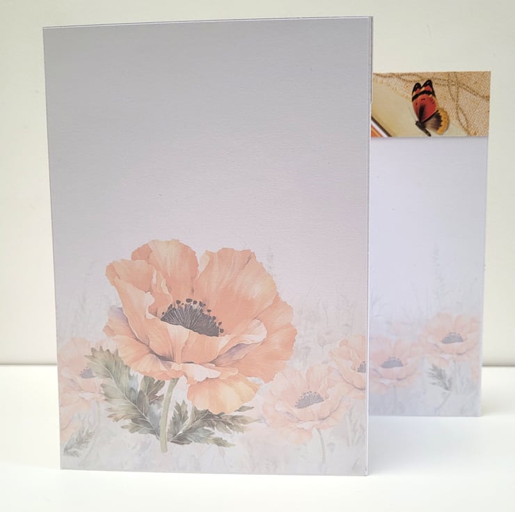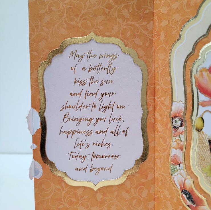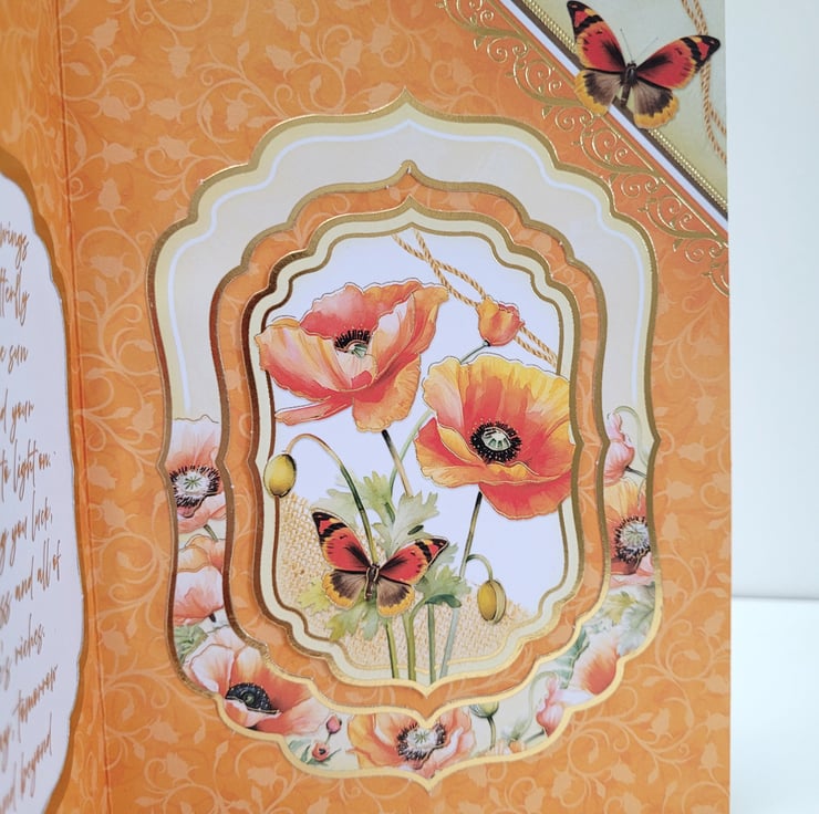 A striking 'Z-Fold' greeting card featuring beautiful poppy flowers and butterflies, accented with gold foiling throughout.