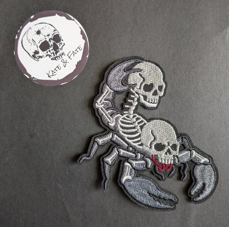 Transform your wardrobe with this striking Skeleton Scorpion Patch. An original macabre design by Kate and Fate, this high-quality embroidered patch is the perfect way to add a dark, alternative edge to your favourite denim jacket, backpack, or hoodie.