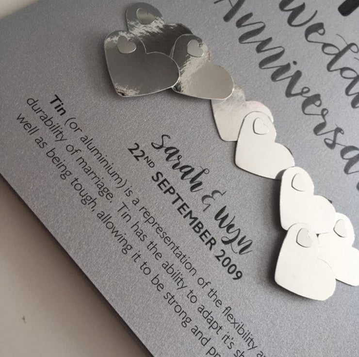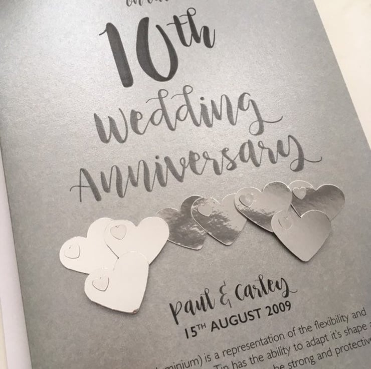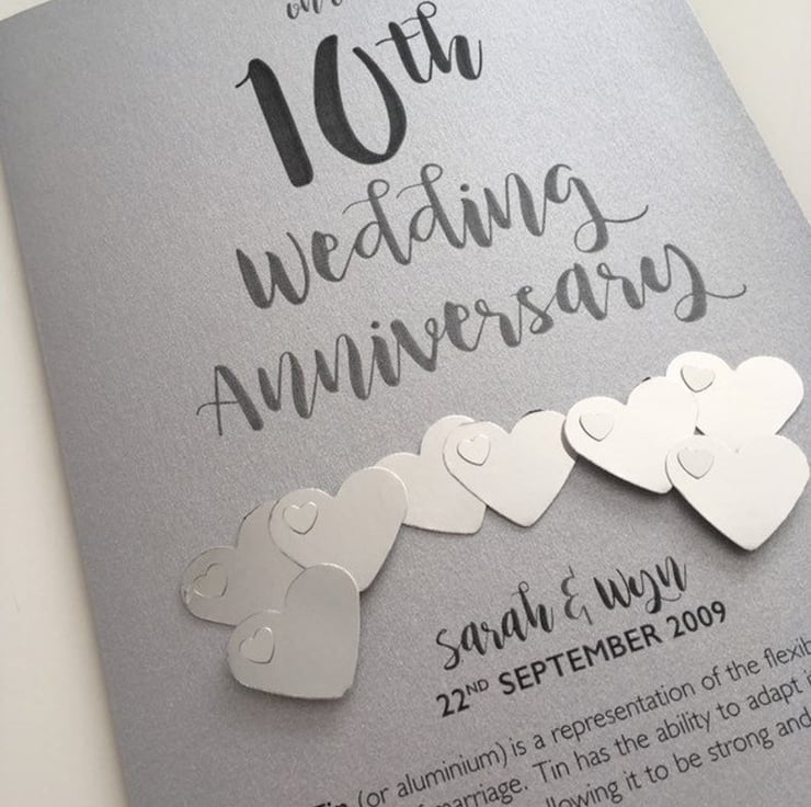 A beautiful keepsake anniversary card for a Tin (10th) wedding anniversary. Hand crafted to order with the utmost care and attention.