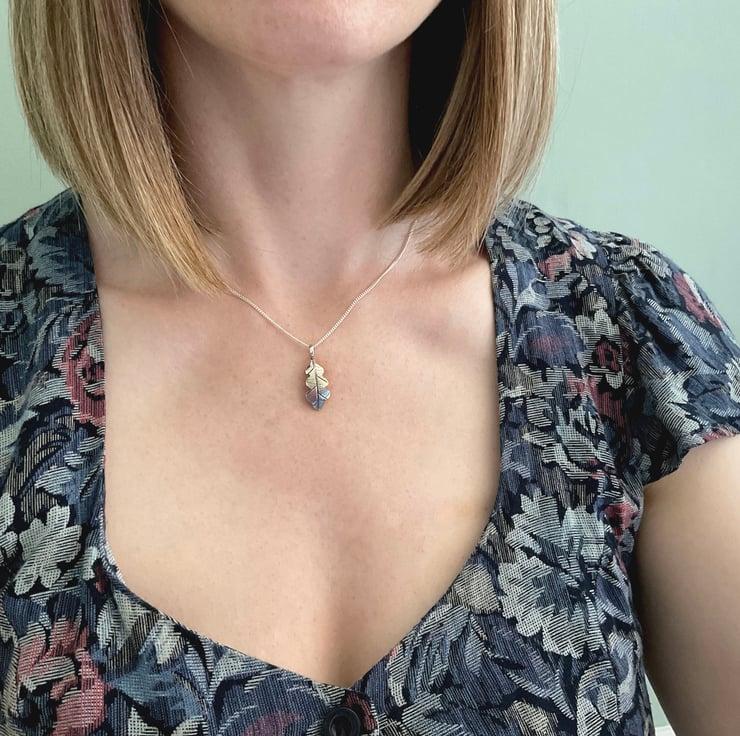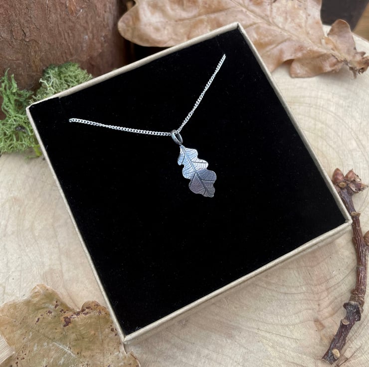 Made in our UK studio, this delicate necklace features a single oak leaf charm, capturing the intricate texture and natural structure of a real leaf. Each charm is taken from a different leaf, making every necklace completely unique. The oak leaf is carefully cut, gently curled, then oxidised and polished to bring out its veins and natural detail.