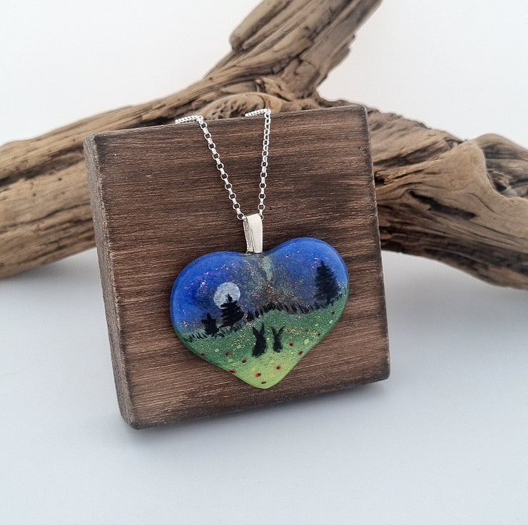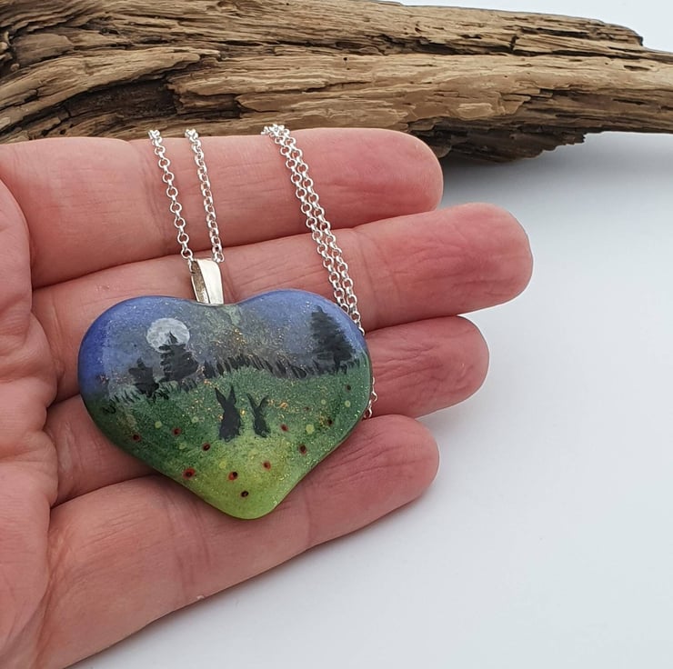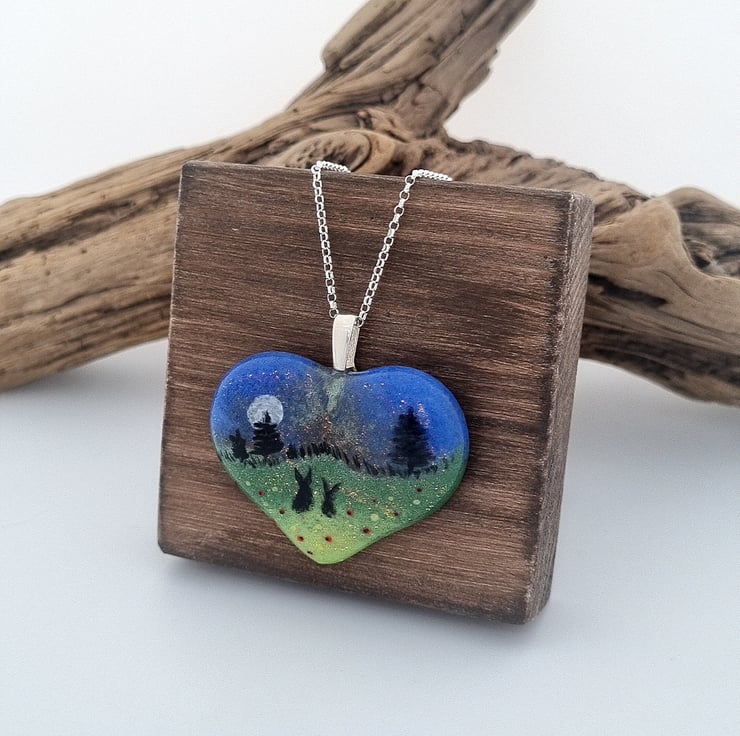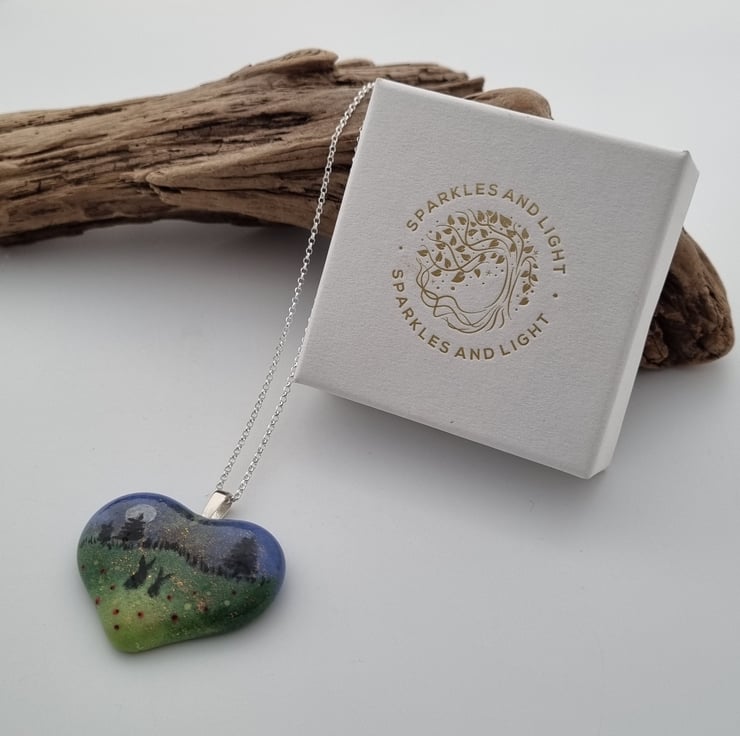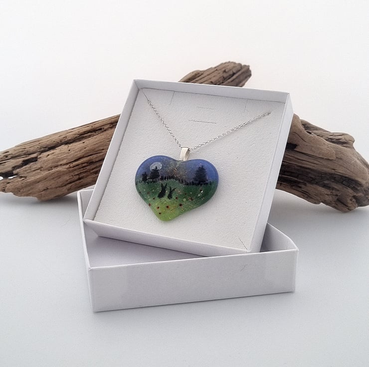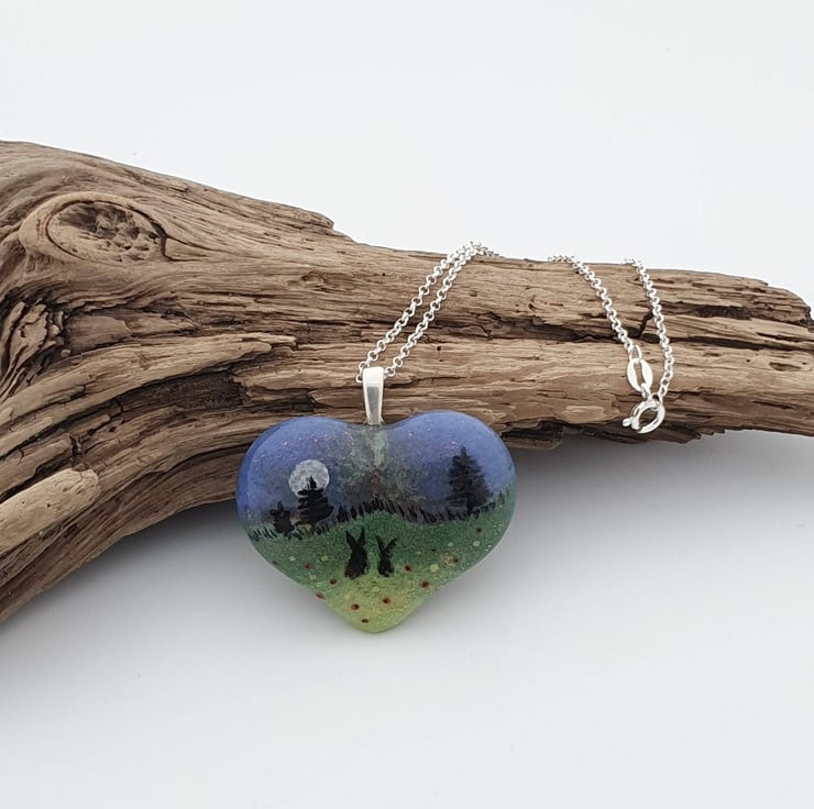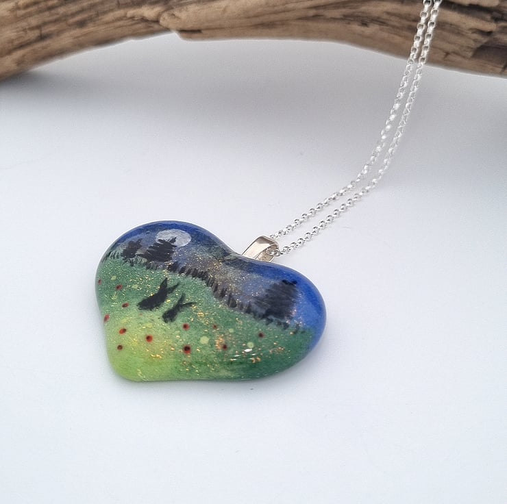 A lovely one of a kind fused glass art pendant suspended on a sterling silver bail, the Moonlight Hares necklace is inspired by landscapes and nature.