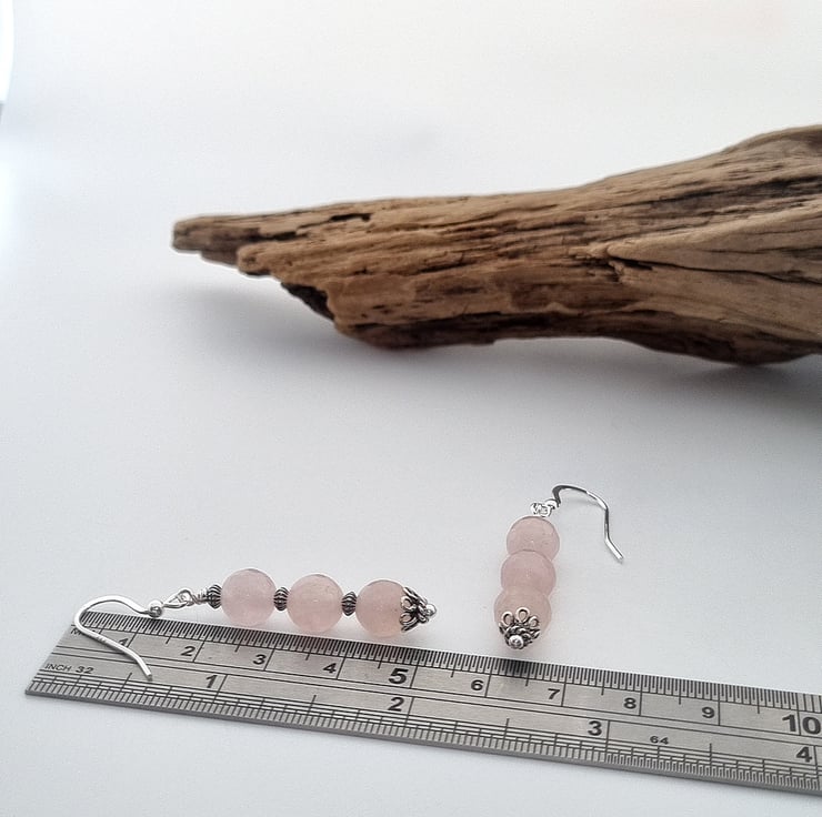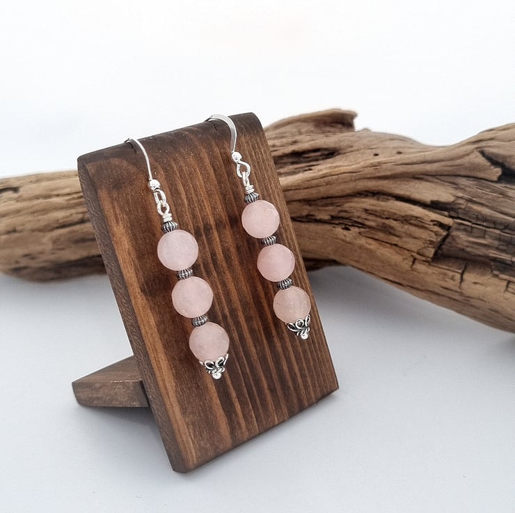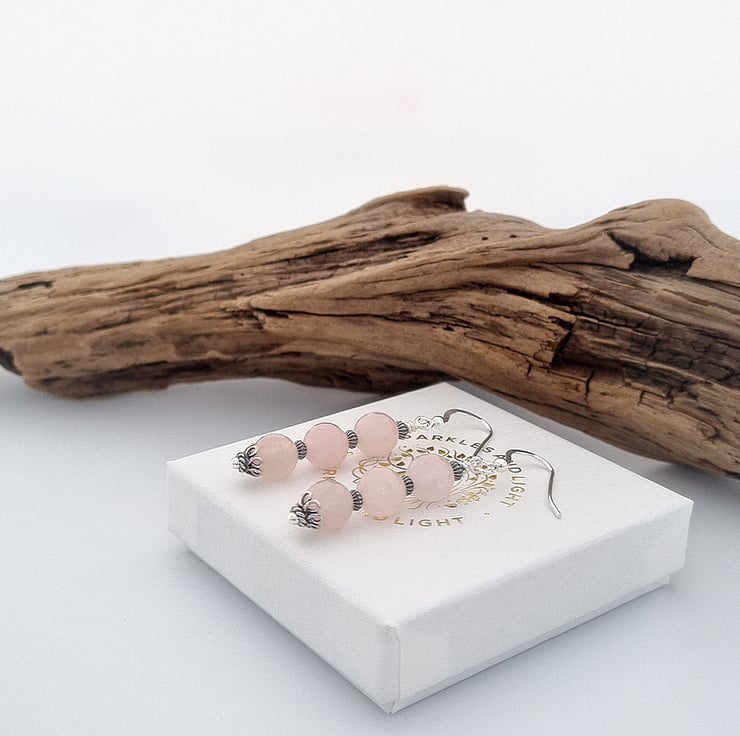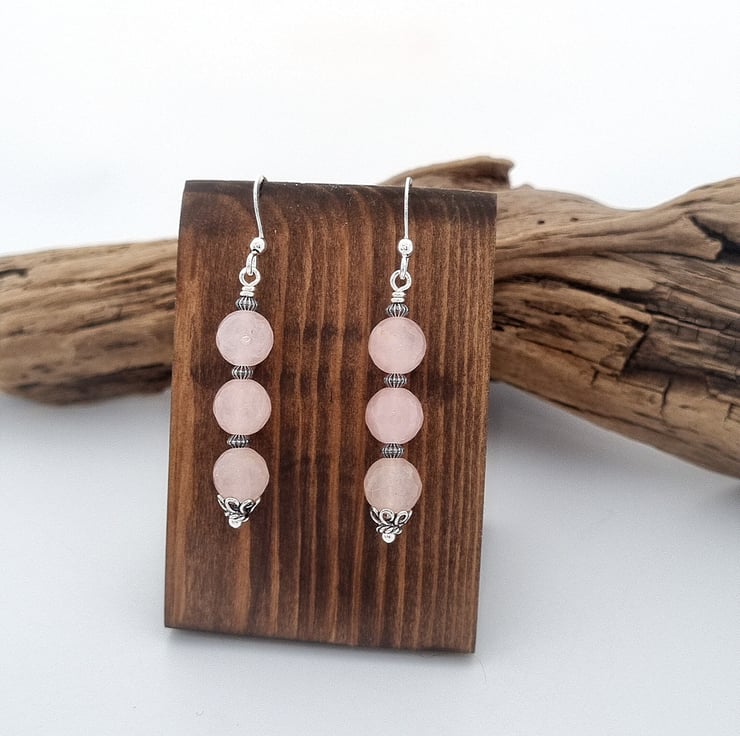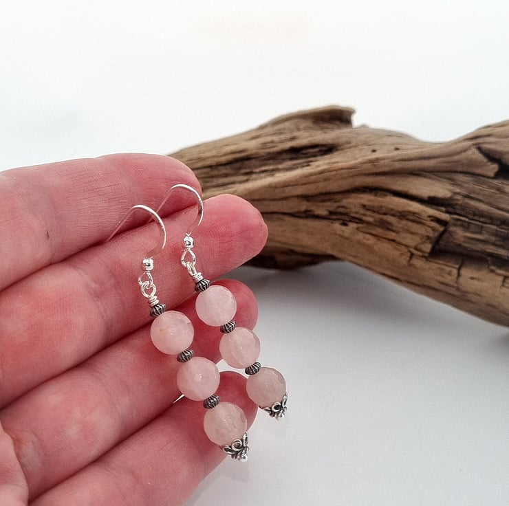 These lovely rose quartz earrings have been made using faceted rose quartz gemstone beads combined with decorative sterling silver beads and bead caps. They have been finished with a secure wire wrapped loop and sterling silver ear wires.