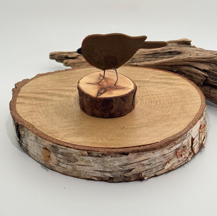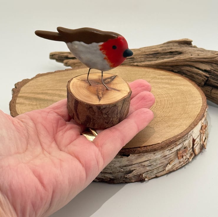 The little robin has been handmade using glass powders and modelling glass binders which have been shaped into a little robin by hand and with the help of a few clay modelling tools. The legs are made using nichrome high temperature wire that is embedded it into the glass.