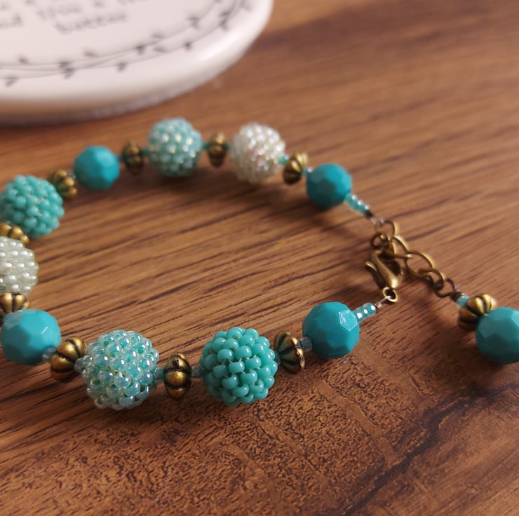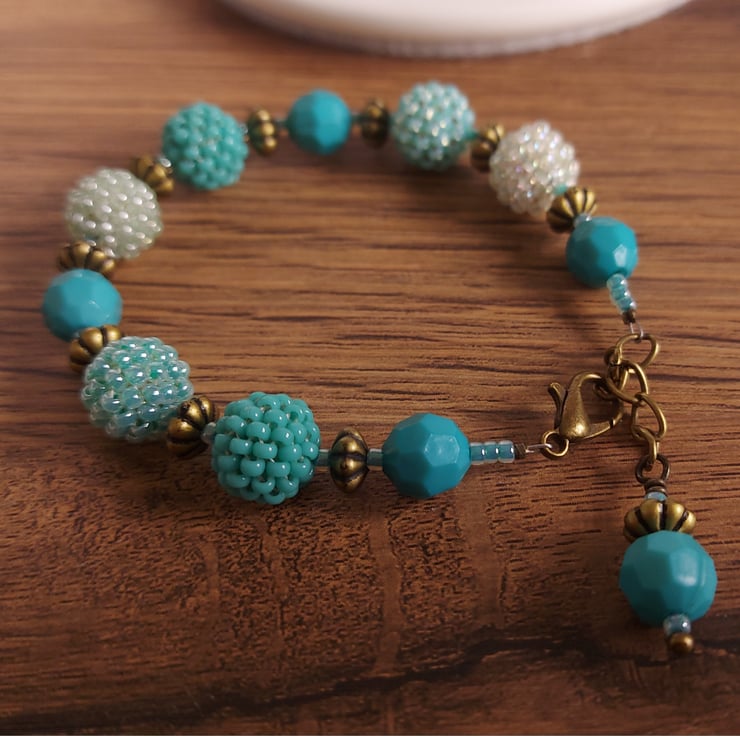 A gorgeous beaded bead bracelet in Turquoise tones; made with seed beads, alloy metal beads and acrylic beads. This bracelet will fit up to a 7.5" wrist.