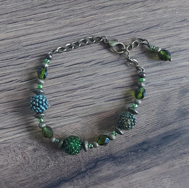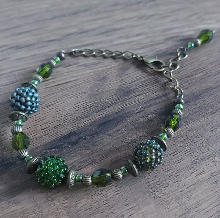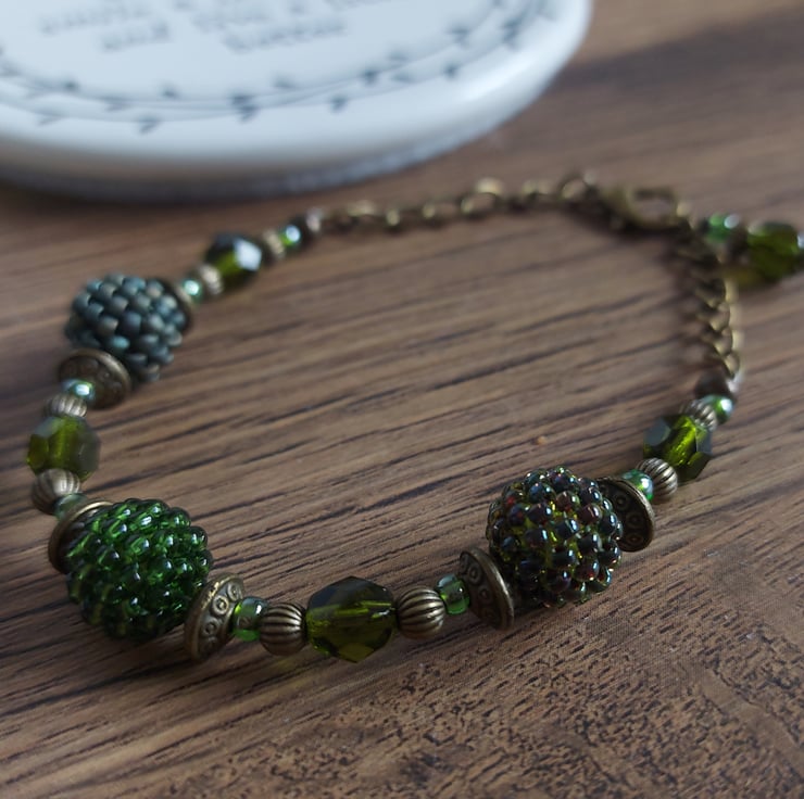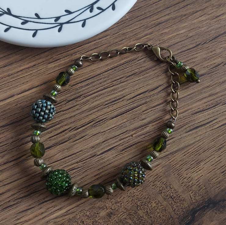 This bracelet incorporates three hand-stitched beaded beads, along with glass fire-polished beads, and bronze-tone accents. It is a beautiful piece in olive and bronze, with a subtle sparkle.