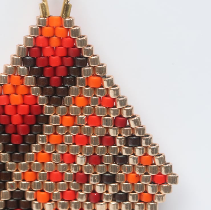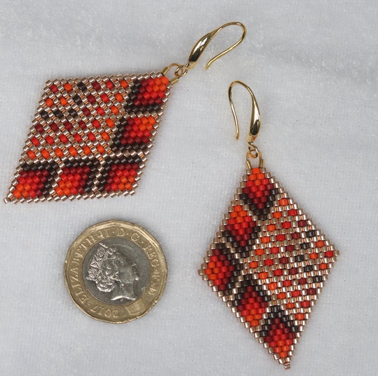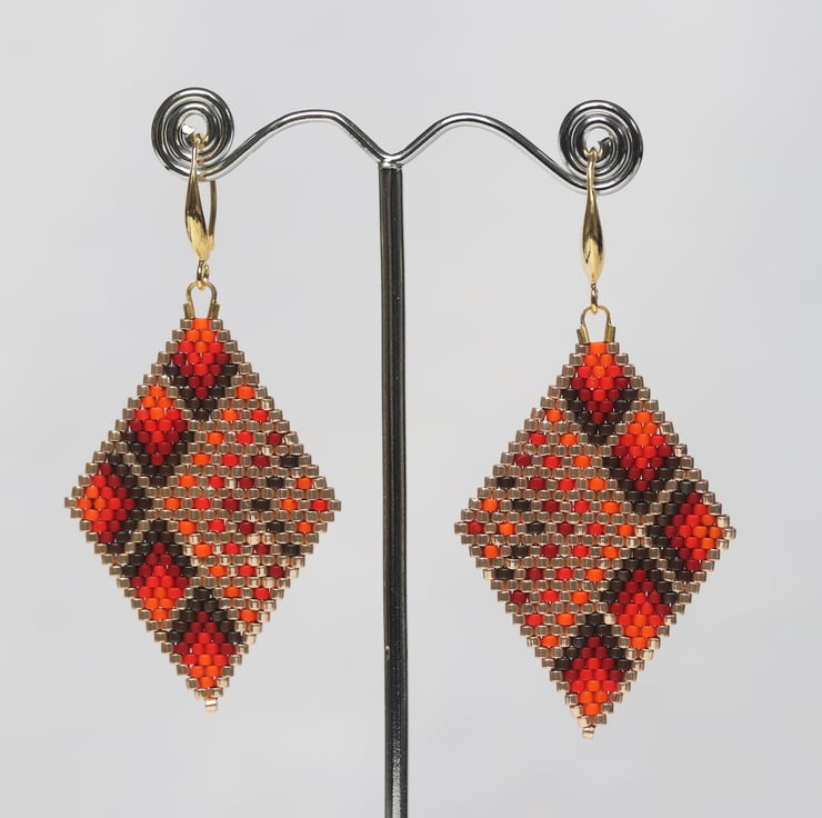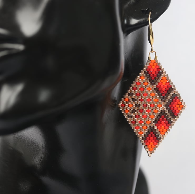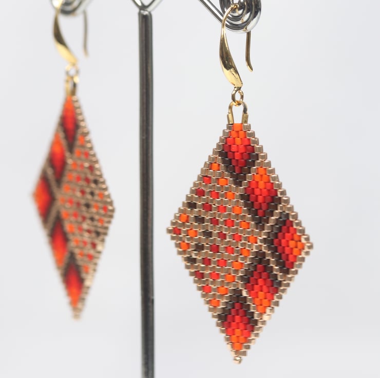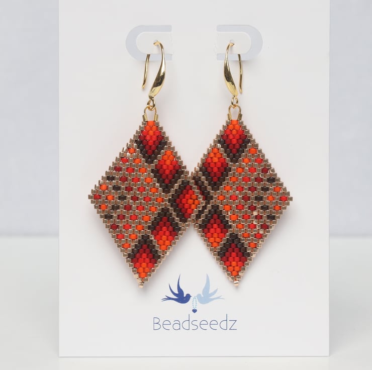 These bold, diamond-shaped earrings make a superb gift for someone who enjoys colourful, handcrafted jewellery. Handwoven from tiny glass Delica beads in warm shades of red and orange, they feature a striking geometric design. They are made using traditional brick stitch, the pattern being the same both front and back. Lightweight and comfortable to wear, they’re finished with gold-plated ear wires and would make a lovely treat for yourself or a thoughtful handmade gift