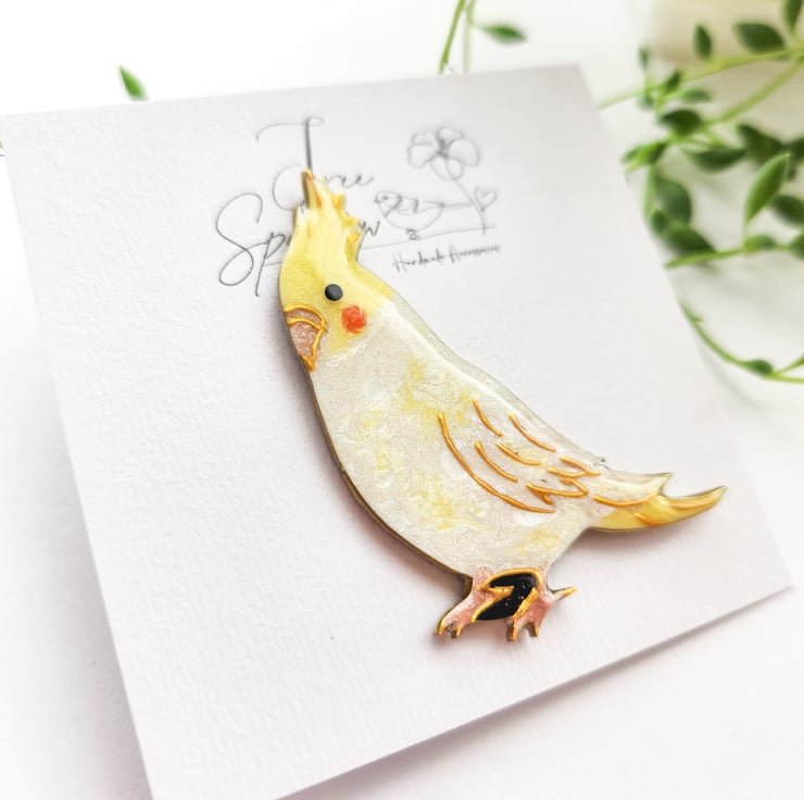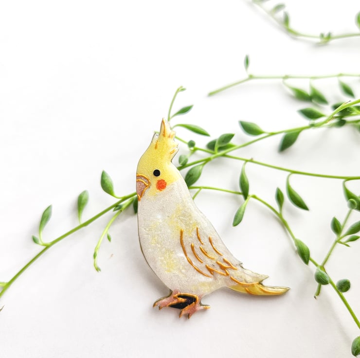 A Cockatiel brooch is hand-shaped, hand-painted and finished with care by hand.