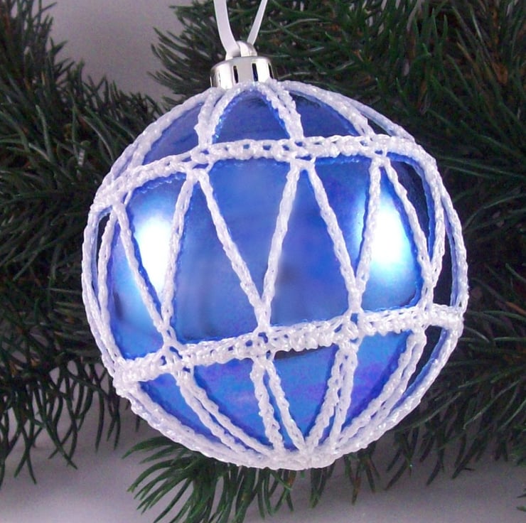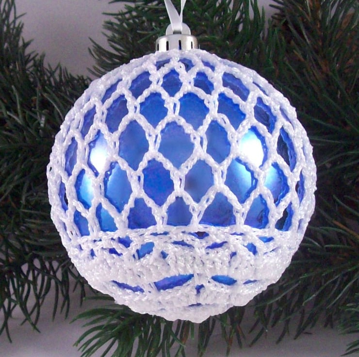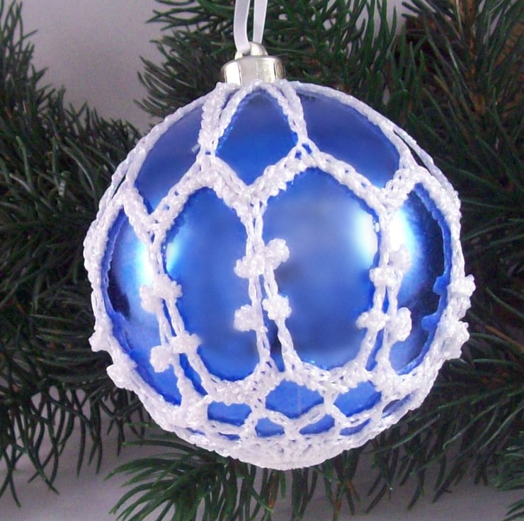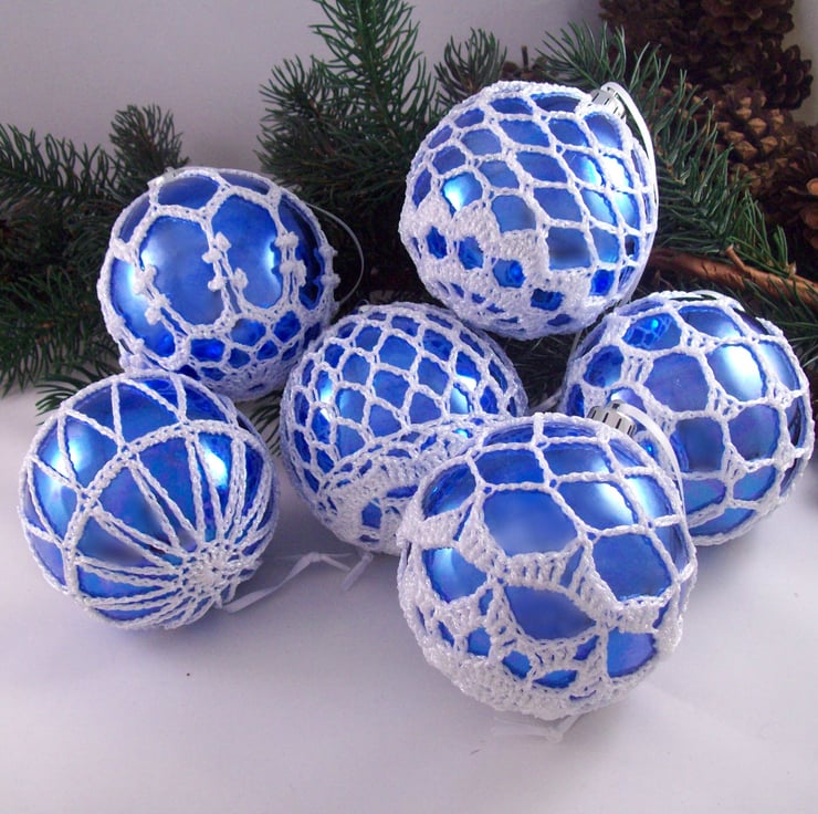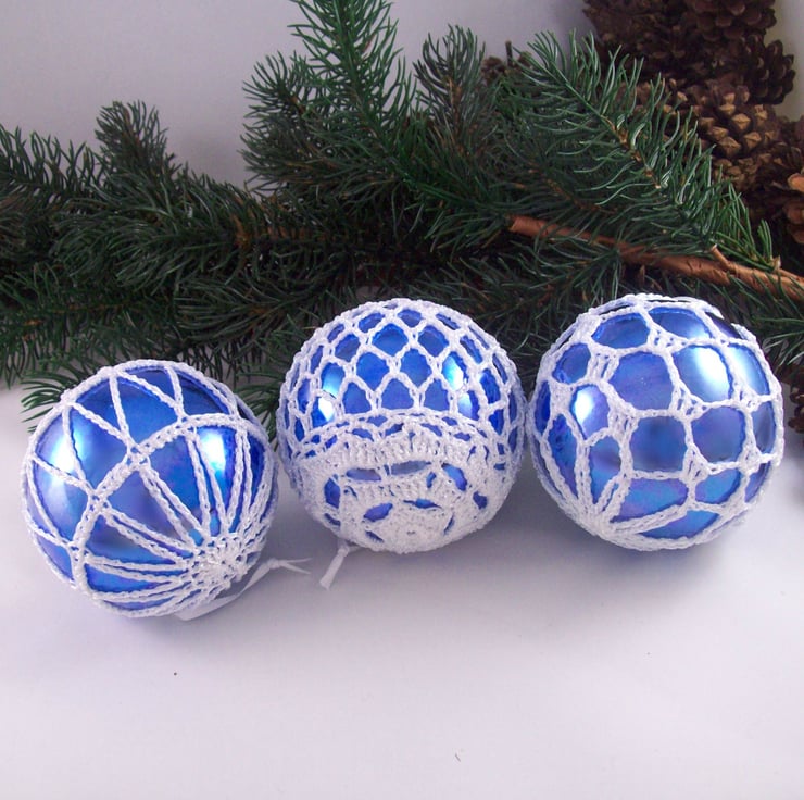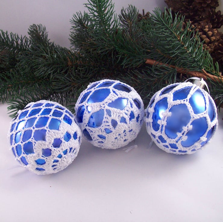 Discover the charm of this unique set of exquisite colbalt blue baubles, beautifully enhanced with hand-crocheted lace in a white colour of sparkly Twilleys Goldfingering—an enchanting addition to your Christmas tree!