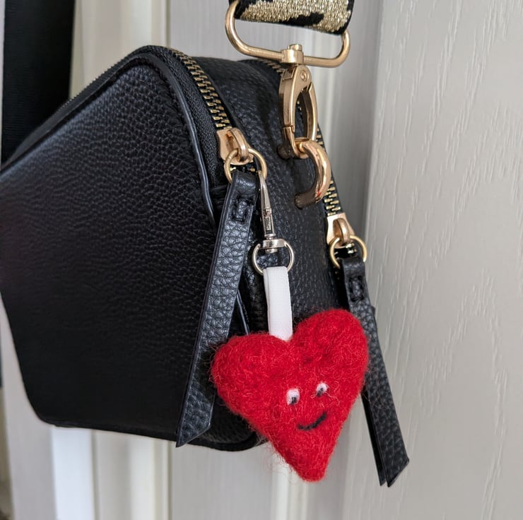 With its friendly smile and warm red wool, it’s like a small reminder that love can be carried in the simplest places.