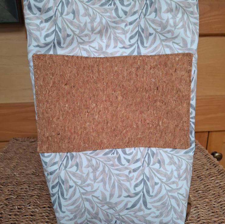 Crossbody bag in a William Morris 'willow' design, printed on a fabric usually used for covering patio chair cushions, so it is fairly weatherproof. Featuring a cork front panel, zipped front pocket and a cork patch pocket on the reverse. Lined in a toning floral print cotton, with inside pocket, magnetic fastener and adjustable cotton webbing strap.