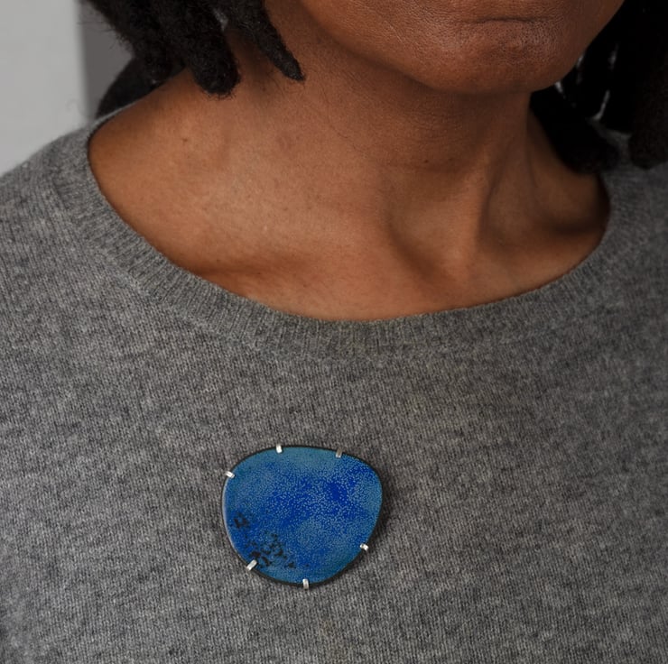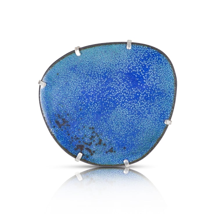 This handmade, one of a kind enamel brooch is inspired by the calm movement and shifting colours of the sea. Formed into a softly textured copper pebble shape, the surface is layered with rich blue enamel, creating depth and subtle variation. The centre features deep, dark blue enamel, gently fading towards lighter blue tones at the edges, with fine black accents that add contrast and definition.