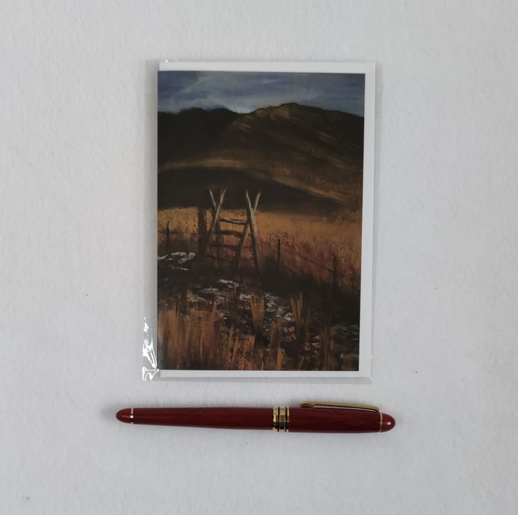 It's 15 x 10cm and comes with a fresh white envelope and is wrapped in a biodegradable cellophane wrap. Printed for me in the UK.