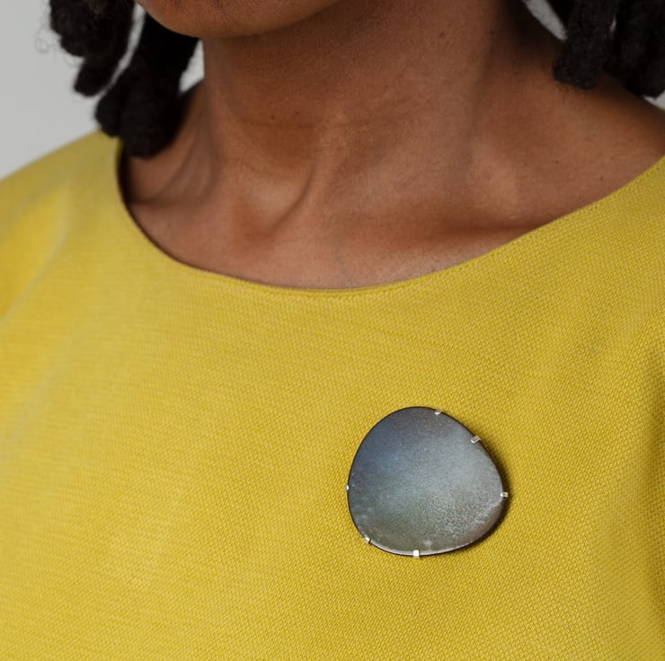 This handmade enamel brooch features softly layered shades of chartreuse, off-white and blue enamel, kiln-fired onto copper and shaped into a smooth, rounded pebble form. The subtle colour transitions evoke mist lifting over a seascape, moving from muted, atmospheric tones into calm, tranquil blues.