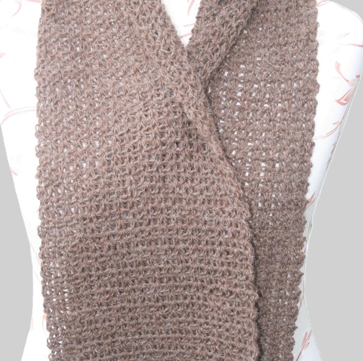 Whilst I have made every effort to capture the true shade of the scarf, it may appear slightly different on your computer screen. Depending on the lighting it can also appear darker brown or paler brown, as shown in the pictures. Made with kind permission of the original pattern designer. The scarf measures approximately 54 and a half inches (L) and 9 inches (W). Care guidance will be sent with your parcel, handwash only.