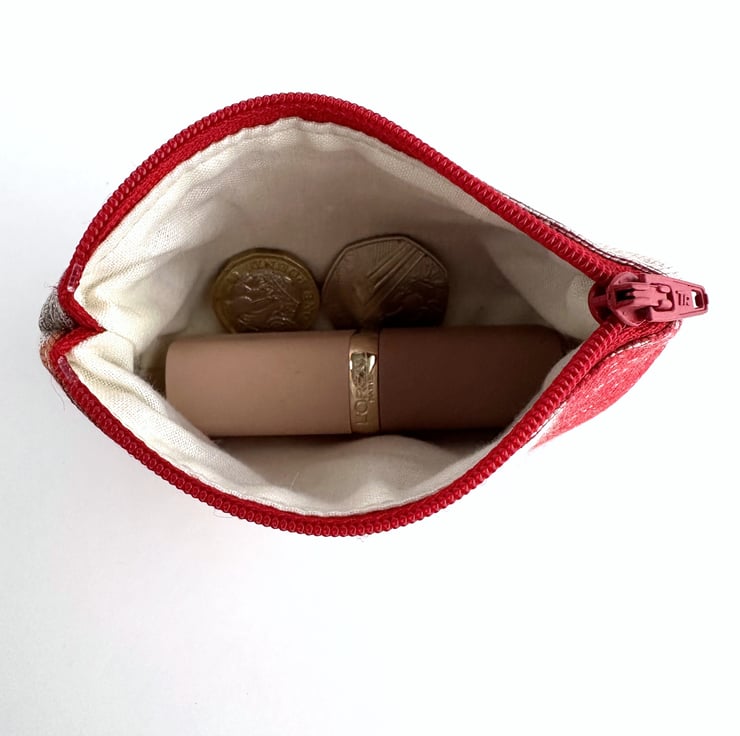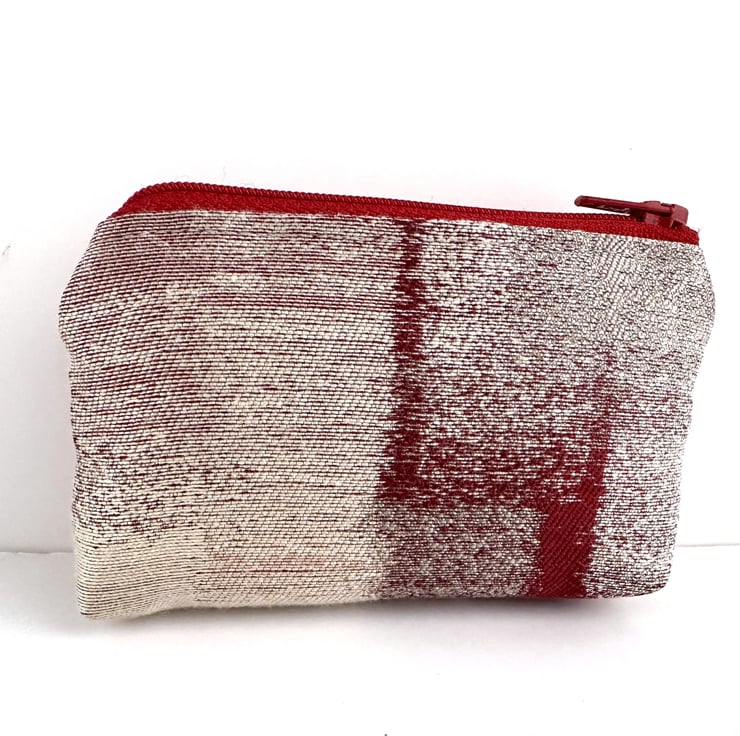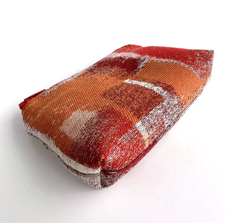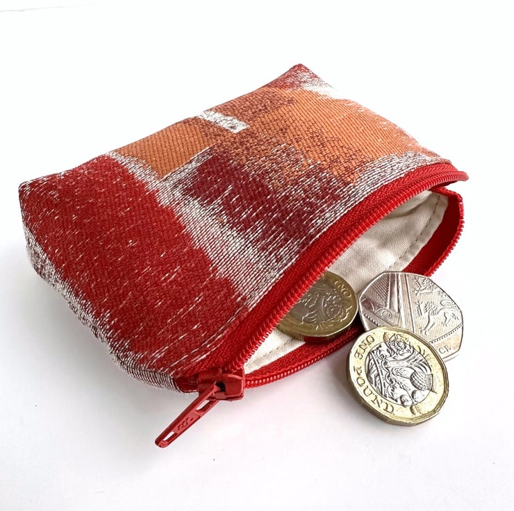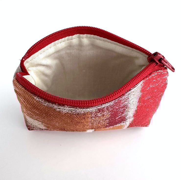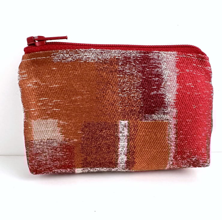 Small coin purse in warm colours. This handy little purse is made from gorgeous fabric in warm, bright colours. The pattern features square and rectangular blocks of colour that appear almost painted. The fabric has a very slight sheen and the colour palette includes warm shades of red, orange, terracotta and gold. The purse fastens with a red zip and is lined with cream fabric. It has a boxed base to give more space inside.