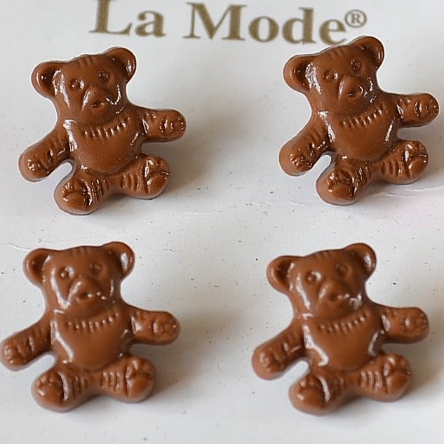 Cute and difficult to find vintage teddy bear buttons by La Mode, still on the original card. 1 unit of 4 buttons available.
