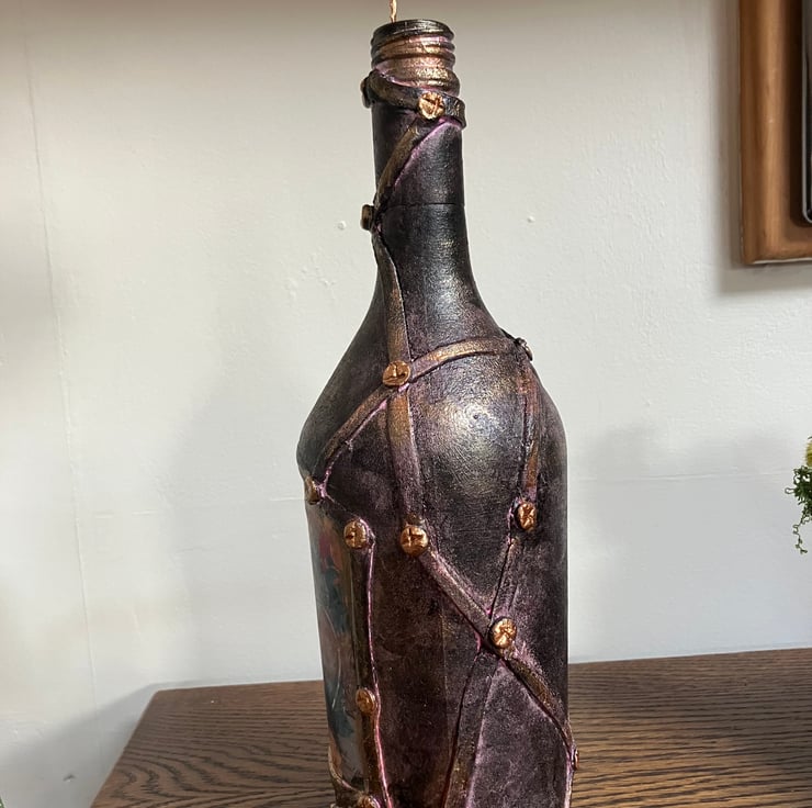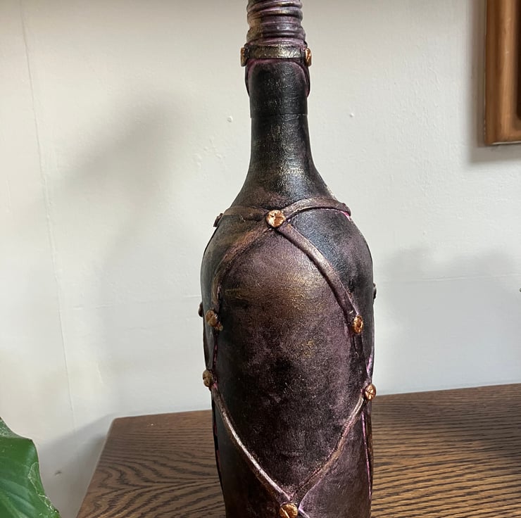 Textured Finish: The bottle is hand-painted with a deep, metallic bronze and plum patina, giving it a heavy, weathered metal appearance.