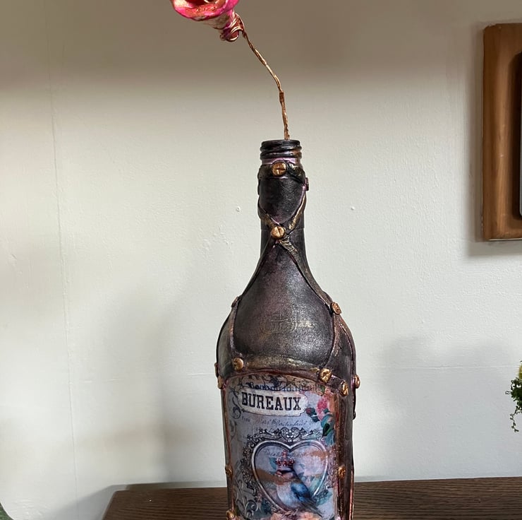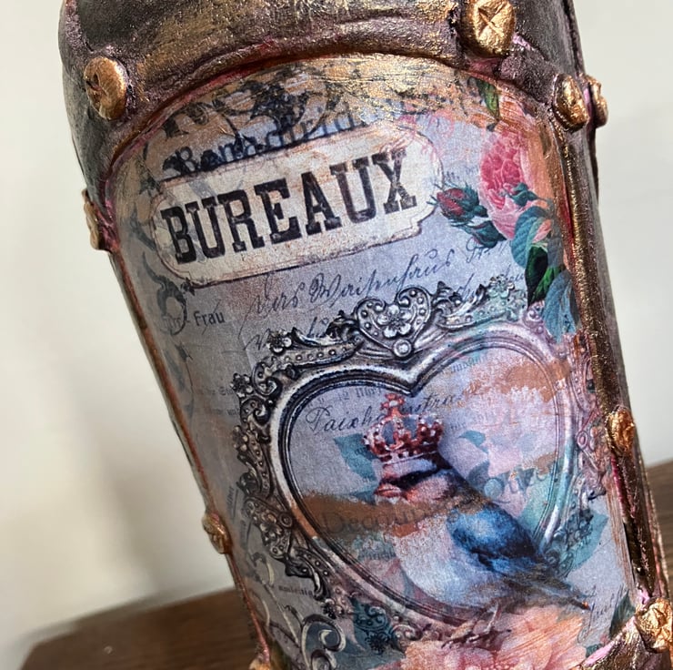 Steampunk Decoupage Altered Bottle Art - "Bureaux" Bird & Rose Sculpture