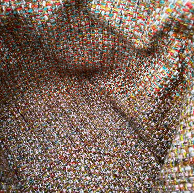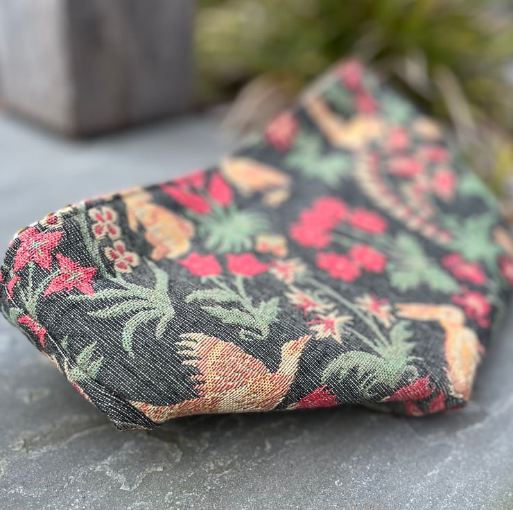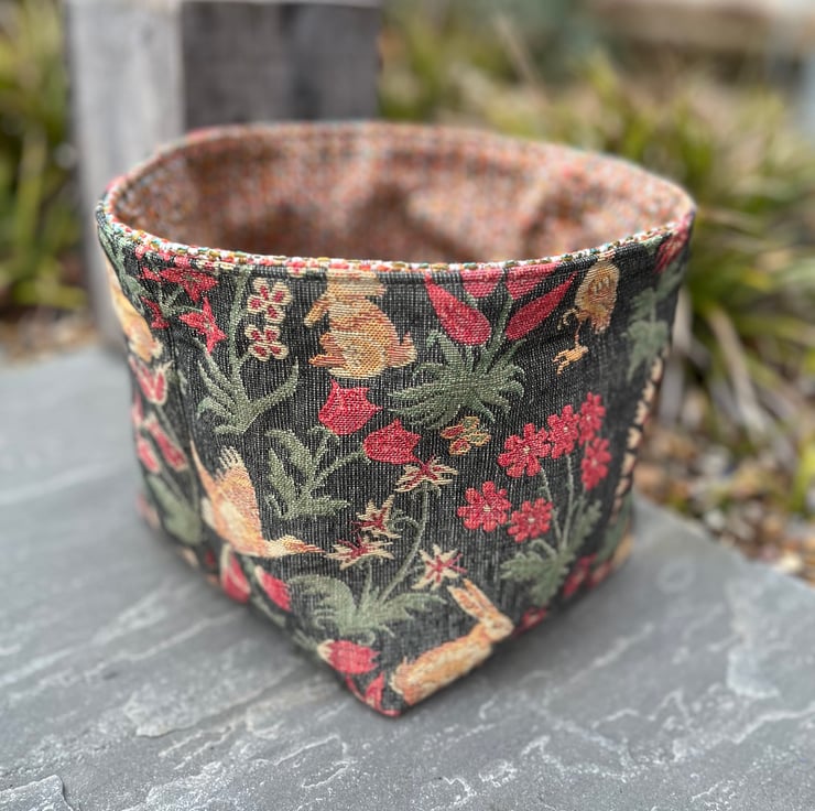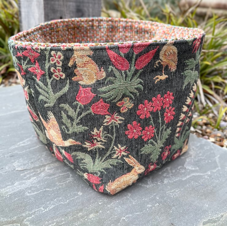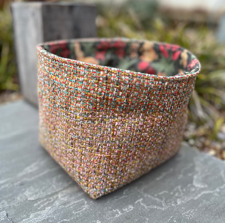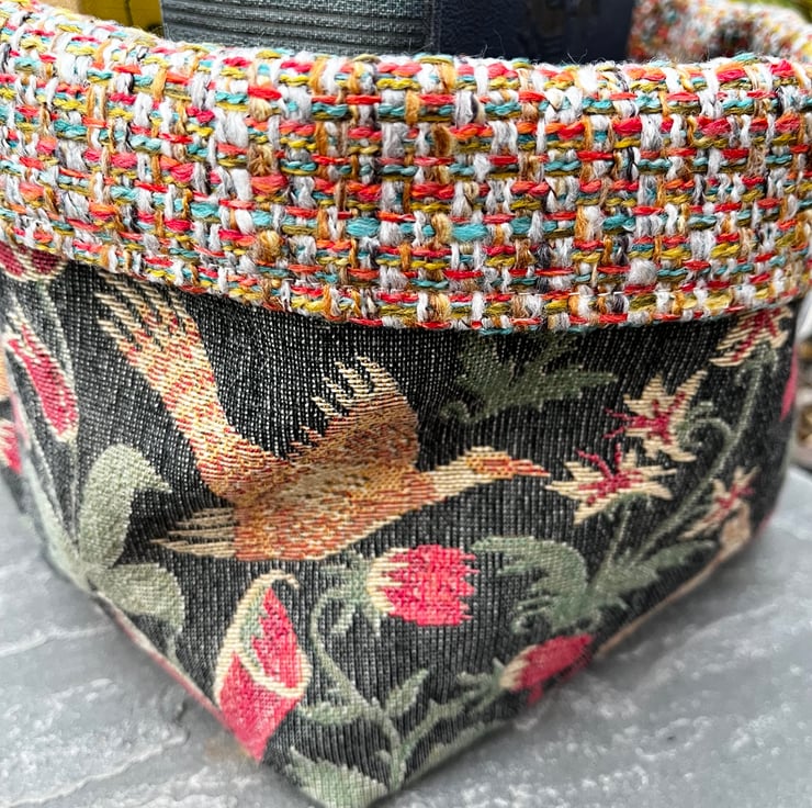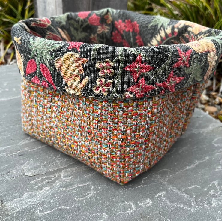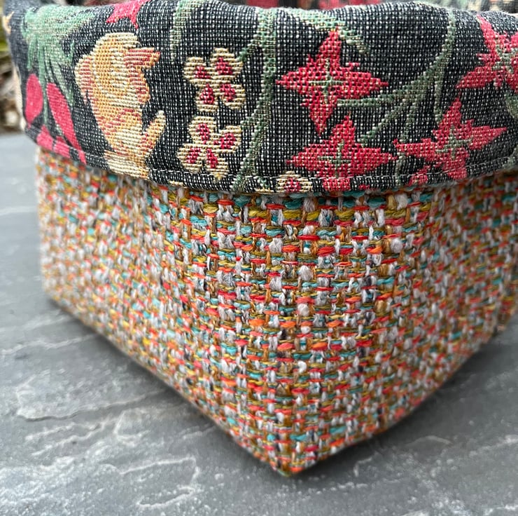 Reversible fabric storage basket made from reclaimed tapestry fabric from a thick door curtain and multicoloured woven upholstery fabric. Can be used with a turn-down to make the most of the contrasting fabrics.