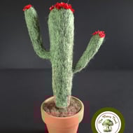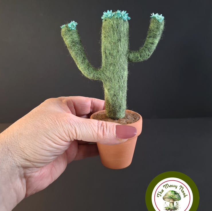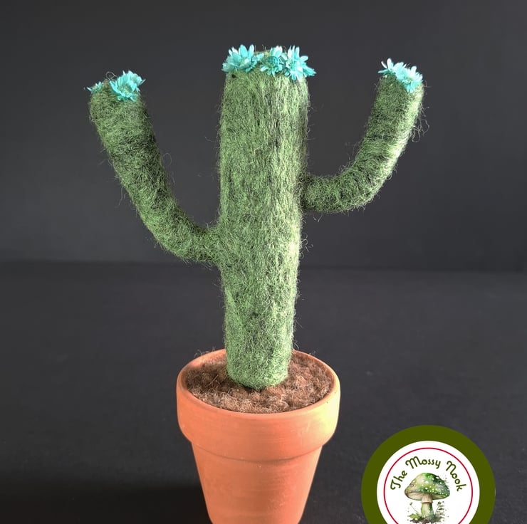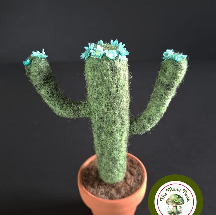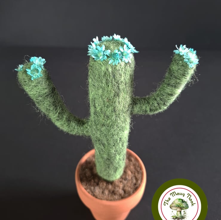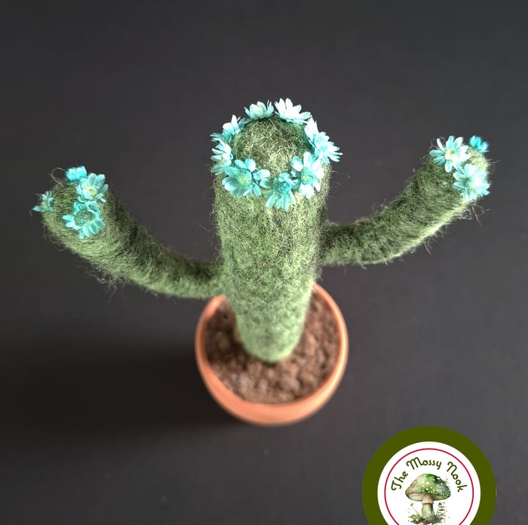 This cactus is in flower and is wearing a crown of beautiful blue blooms (which are actually tiny dried flowers) and more of the same flowers on the tips of its “arms”. It sits in “soil” in a real terracotta plant pot.