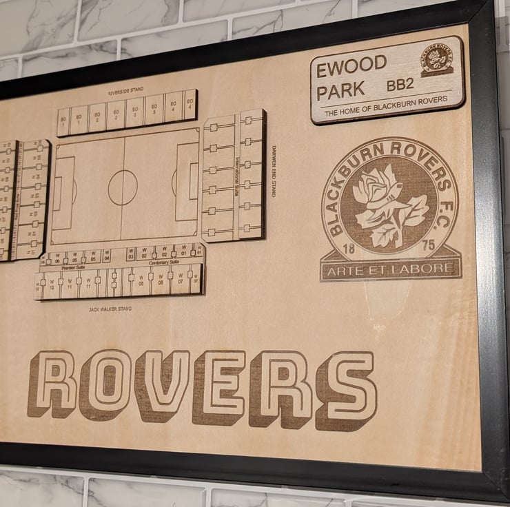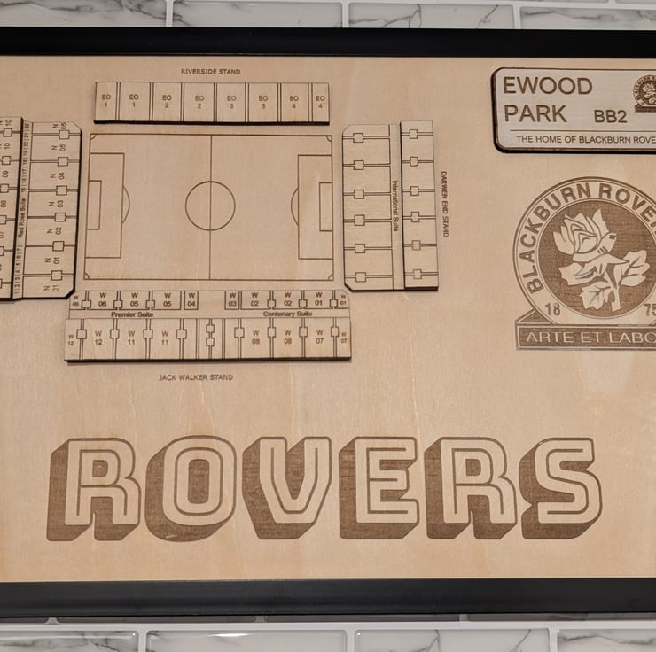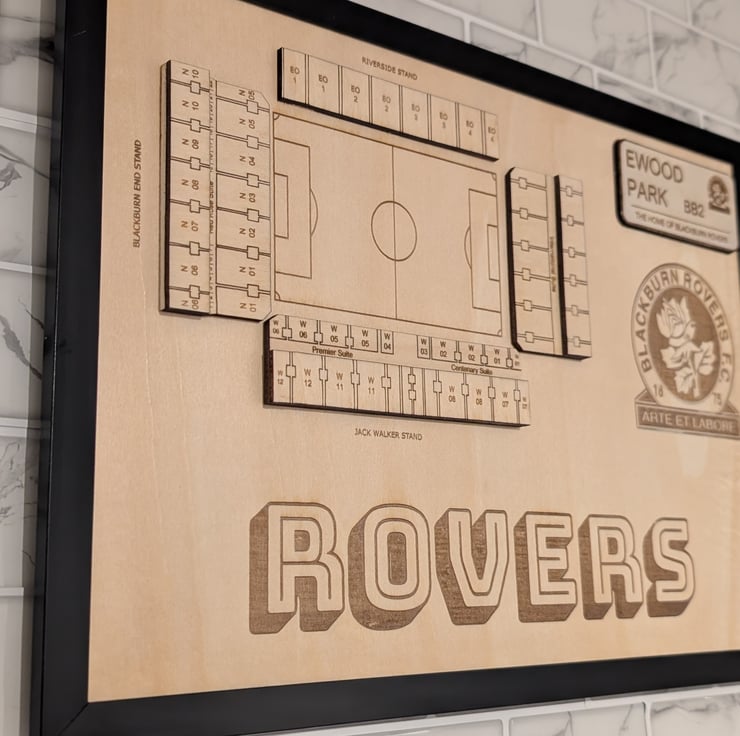 Laser engraved Blackburn Rovers wall plaque featuring a 3D seating plan of Ewood Park as well as the club nickname "Rovers" engraving. This is the perfect gift for any Blackburn Rovers fan and will bring a touch of class to any mancave. Other teams available on request.