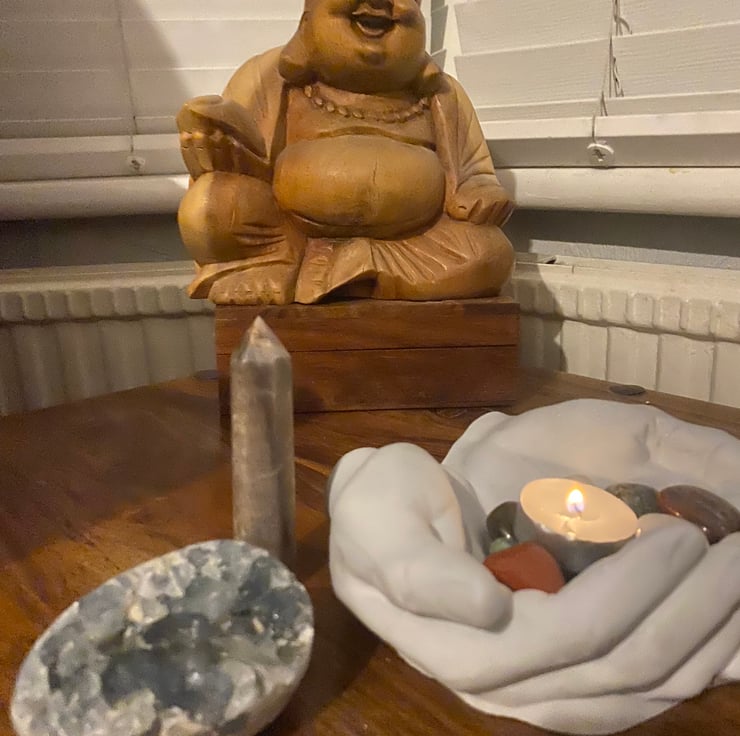 This piece is intended as a decorative ritual object. Always place candles safely and never leave a lit flame unattended.