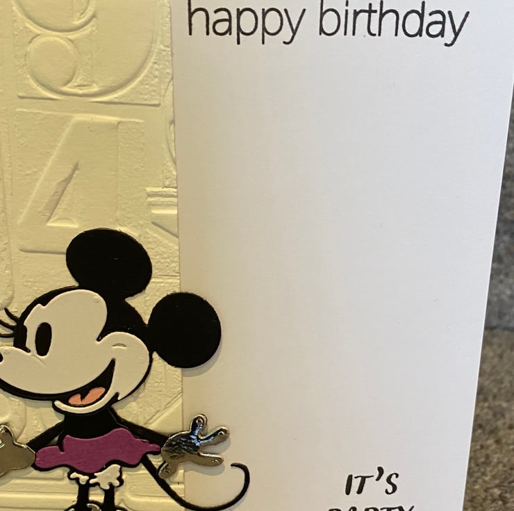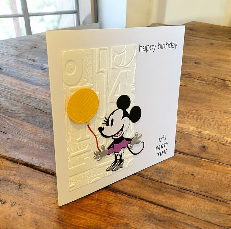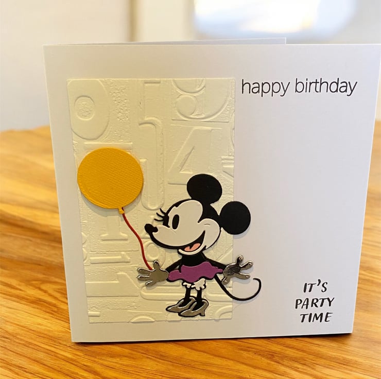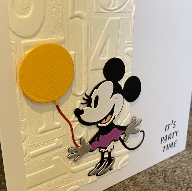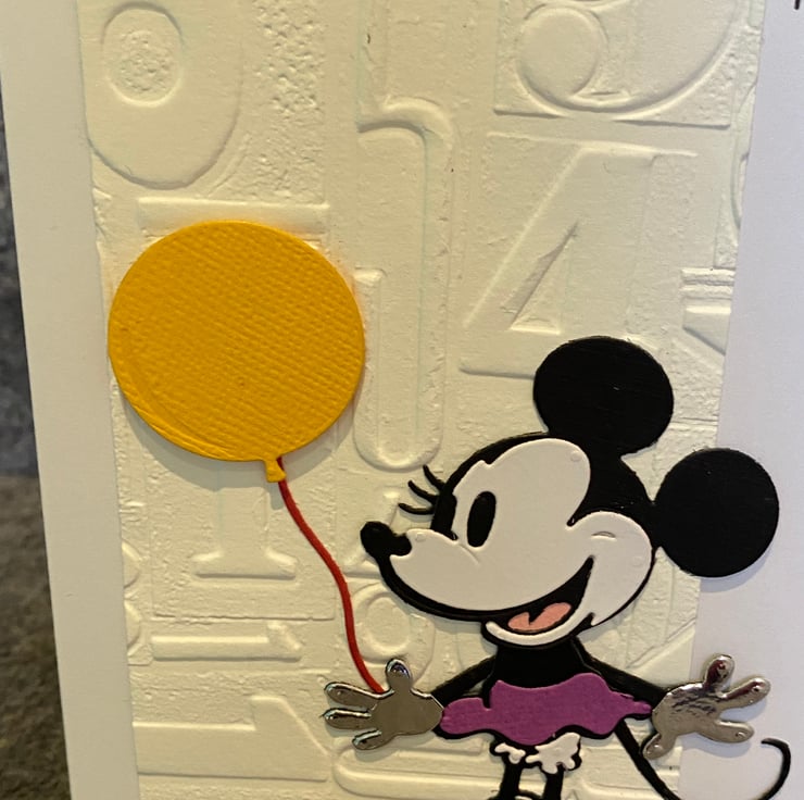 Created to bring a burst of fun to any celebration, this Minnie Mouse card pairs a playful embossed number background with a bright balloon and handstamped sentiments—perfect for marking magical birthdays of any age.
