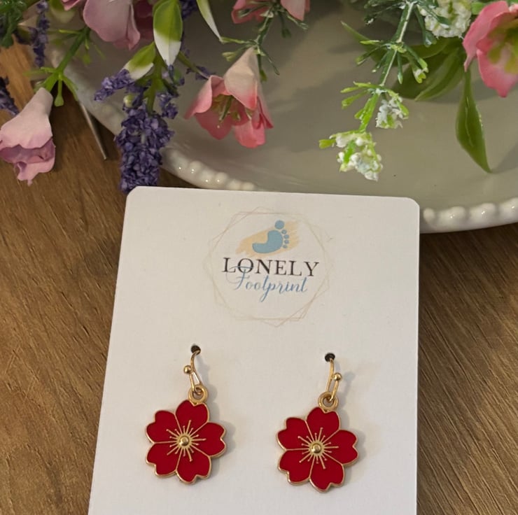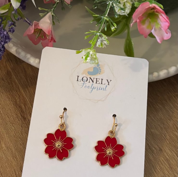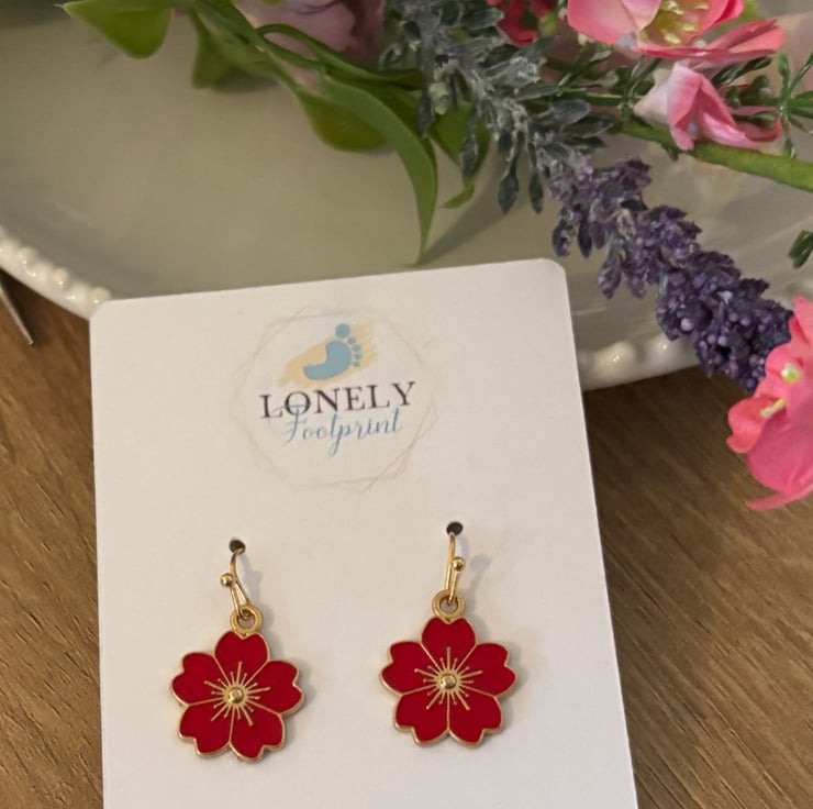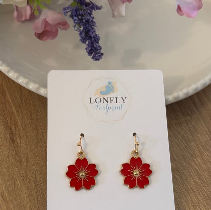 Pretty enamel flower charm earrings in a warm red shade. The floral design gives them a cheerful, nature inspired feel and adds a lovely pop of colour to everyday outfits.