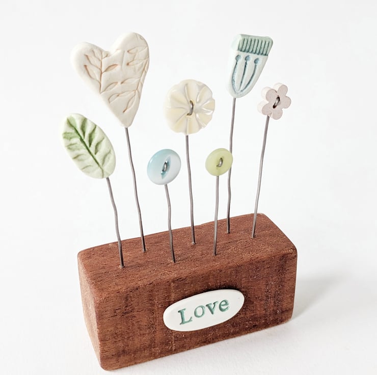 A hand stamped clay heart stands on a wire stalk in a wooden block.