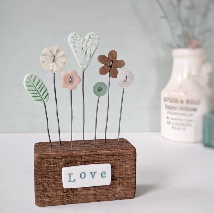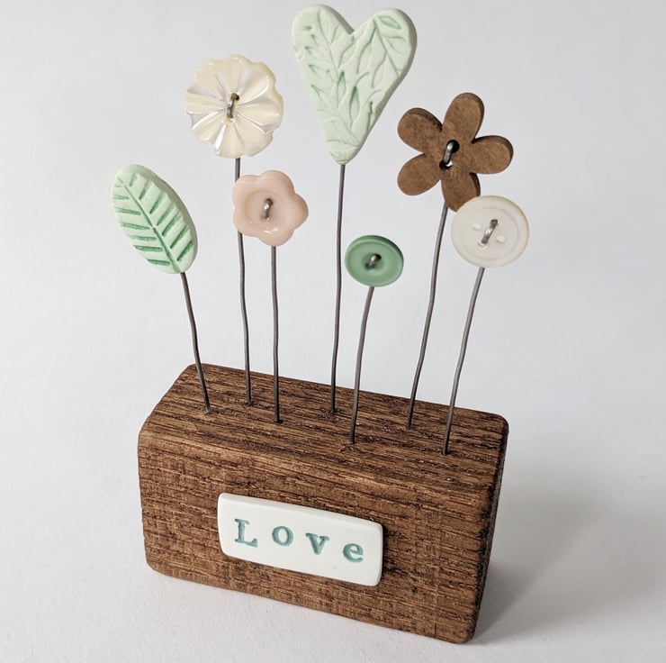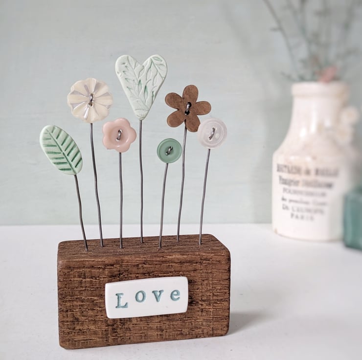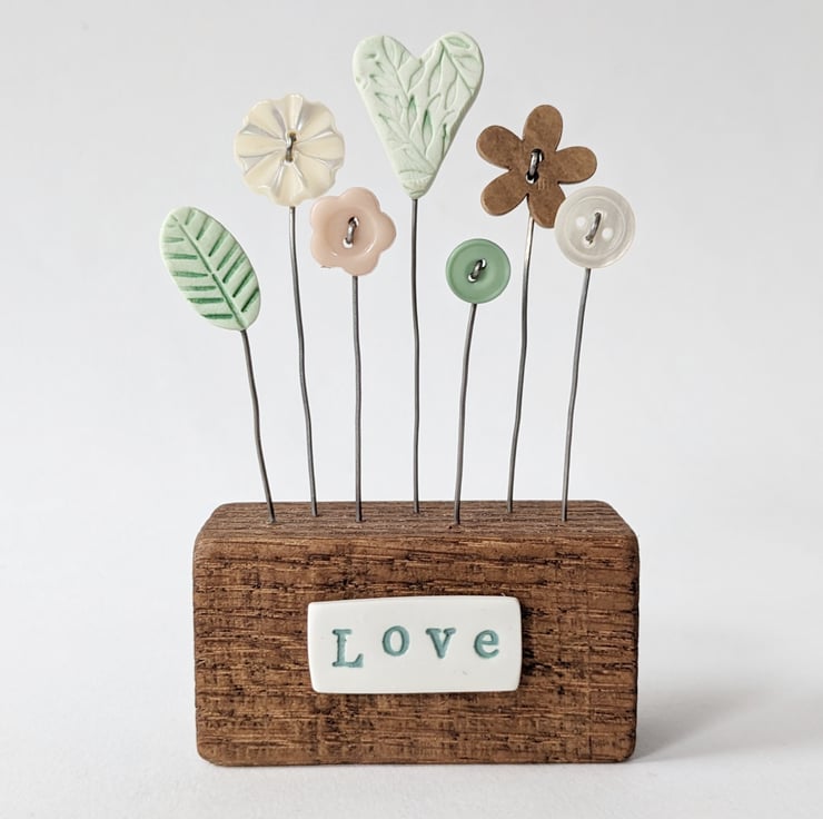 Handmade from polymer clay the heart, flower bud and leaf are textured, fired and painted to finish.