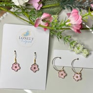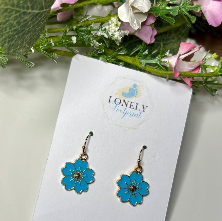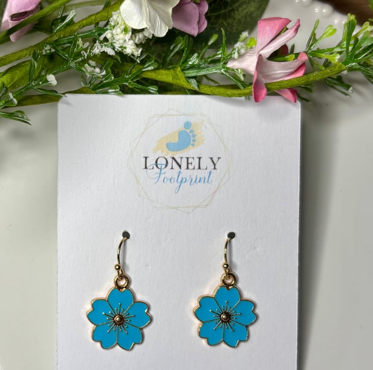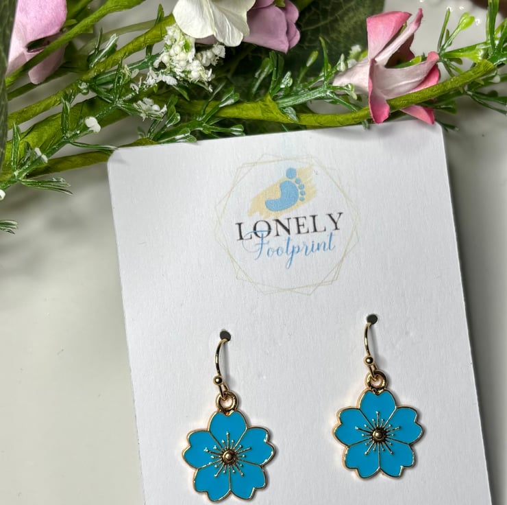 Pretty enamel flower charm earrings in a warm blue shade. The floral design gives them a cheerful, nature inspired feel and adds a lovely pop of colour to everyday outfits.